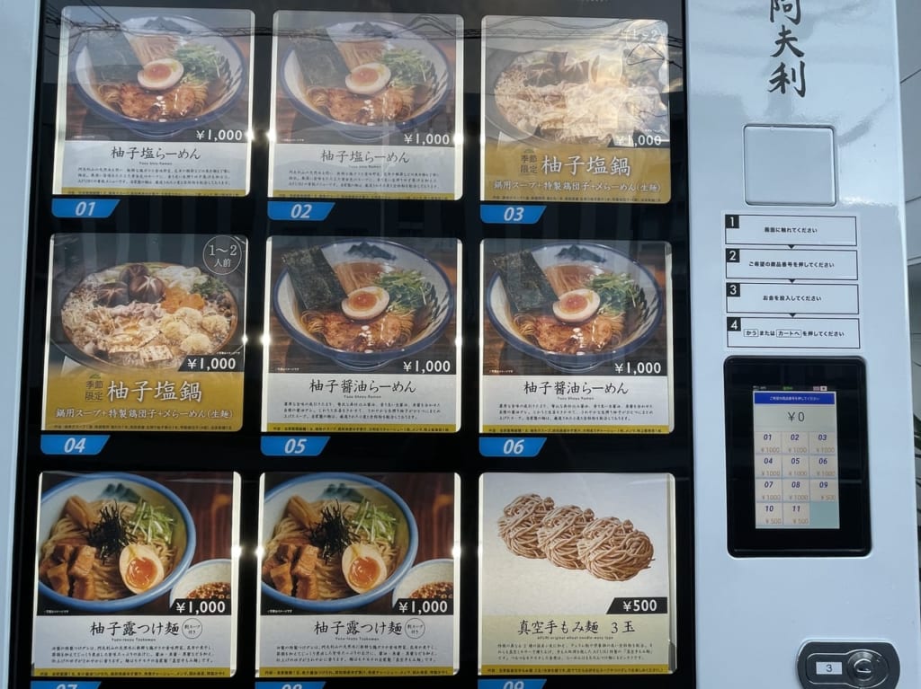 もう1台の冷凍自販機には、とんこつ醤油らーめん750円、チャーシュー麺900円、野菜餃子15個1,200円、粟国の塩らーめん750円です。