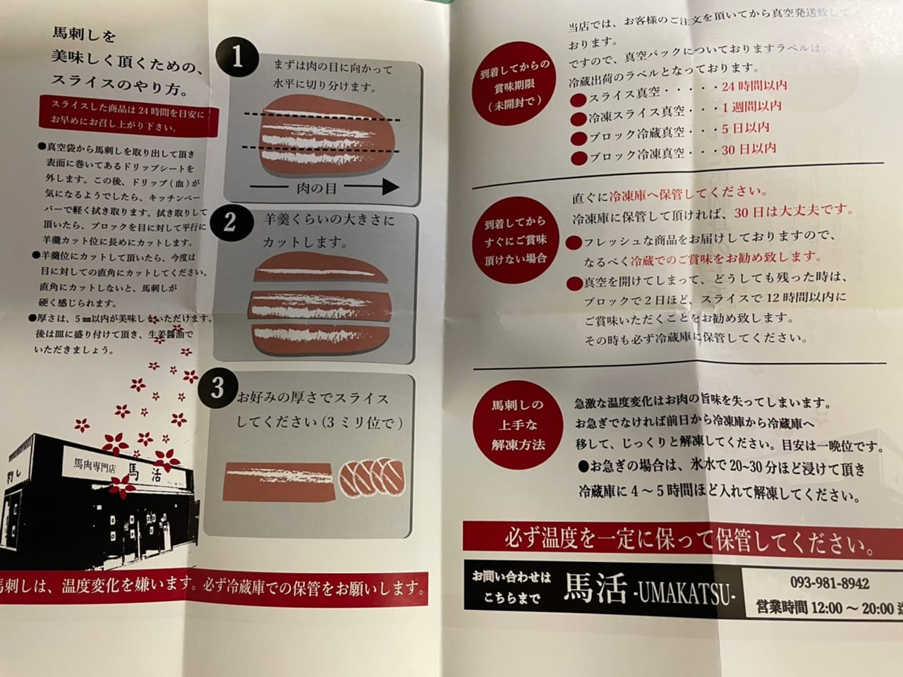 馬刺しは、専用の馬刺しのタレで食べたり、生姜やニンニク醤油と食べたり、家で食べるので、お好みで好きなたれを作って食べることができますね