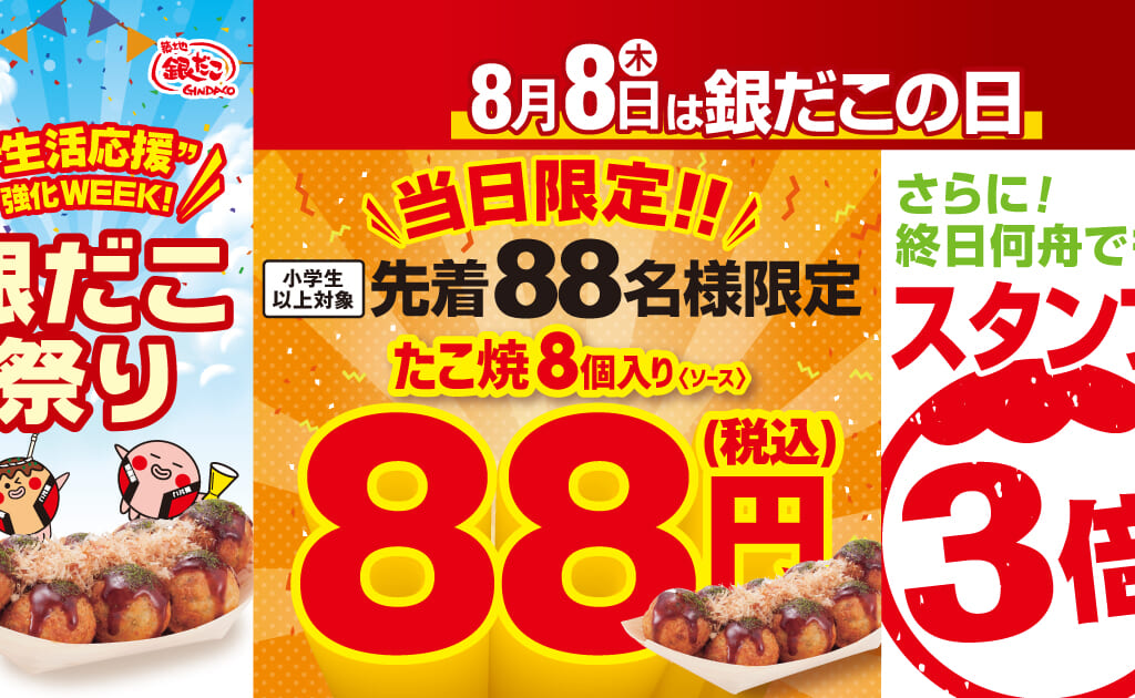 第2弾は、スタンプが貯まるとたこ焼が無料でもらえる 「銀だこスタンプカード」 のスタンプが、3月8日(土)は 3倍!、9日(日)は 2倍 ! を実施します。※3月8日は、「8のつく日(スタンプ2倍)」 と重なるため、今回は3倍となります!