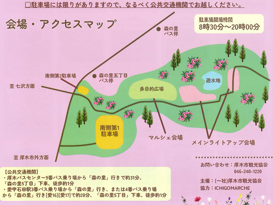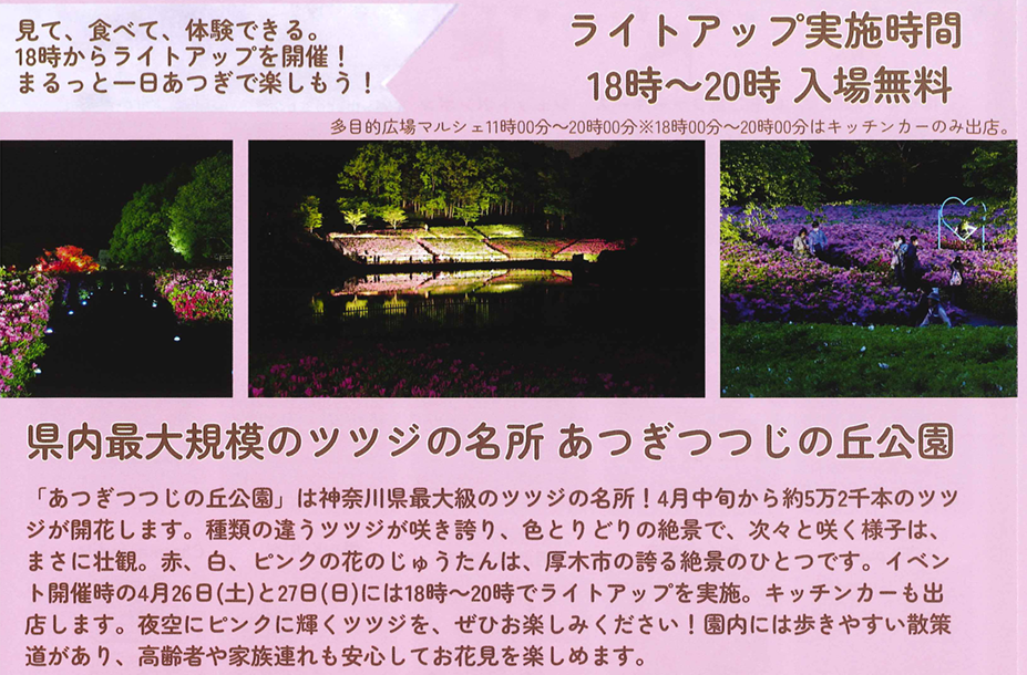 厚木市観光協会より、楽しいイベントのご案内が届きました!2025年4月26日(土)・27(日)に厚木市森の里にあるあつぎつつじの丘公園で、恒例のライトアップに加えて、今年は11時よりマルシェを開催いたします。