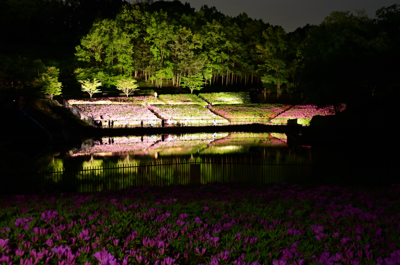 県内最大級のツツジの名所で約5万本のツツジが咲く光景は圧巻です。空の青にツツジのピンクがキラキラと映えてきれいです。夜はそれをライトアップしますので、昼とはまた違うピンクの輝きがとても素敵です。ぜひ足を運んでみてください。