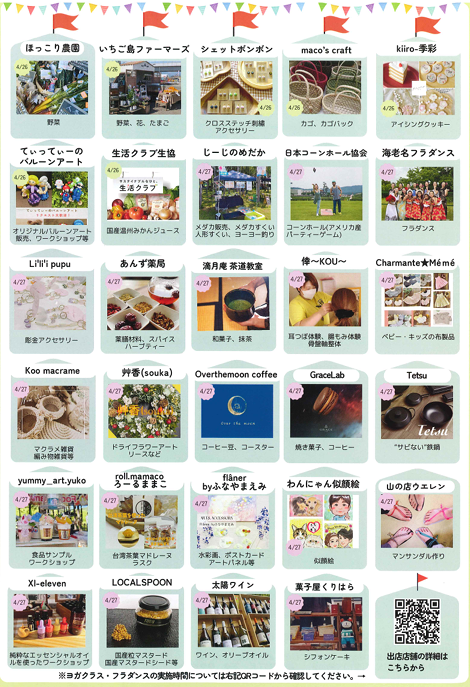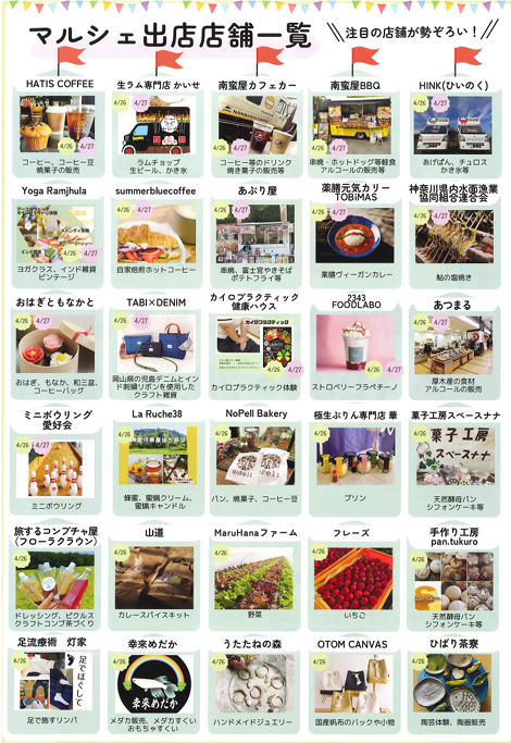 11時~18時には、多目的広場で飲食店、カフェ、農家、雑貨、クラフト、キッチンカー等が出店します。マルシェ出店店舗紹介します。