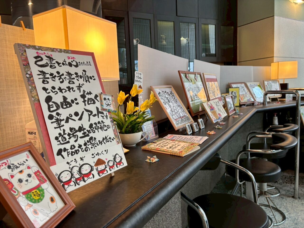 入り口手前には、己書41期師範の由弥さんの作品が展示されています。