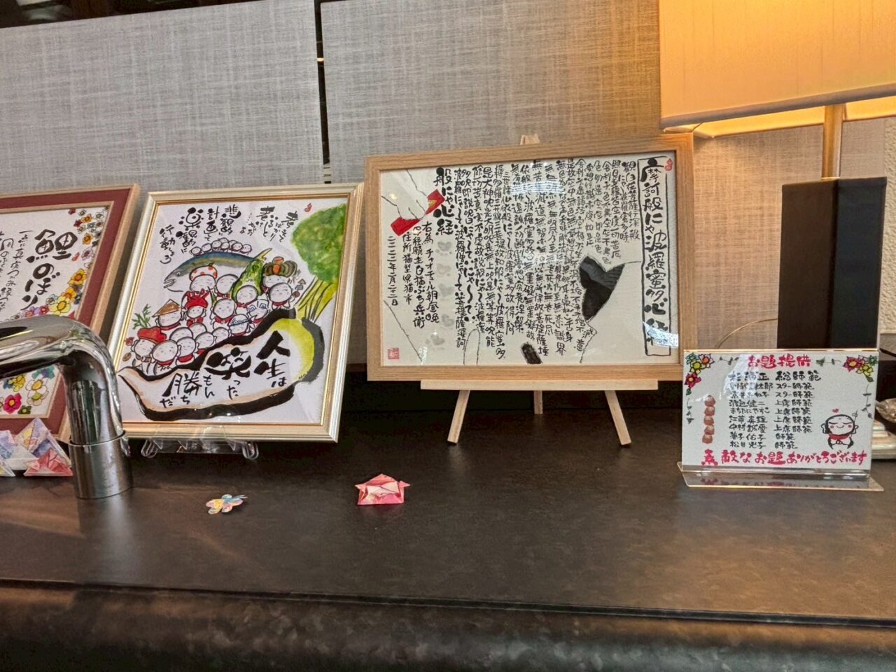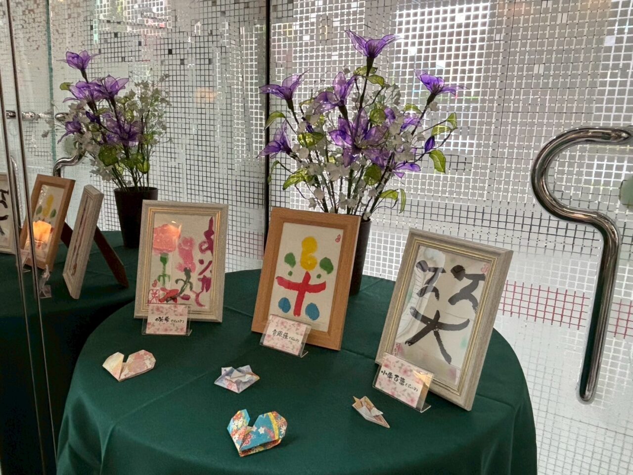 作品の中に展示されている、折り紙や、アメリカンフラワーは道場生の作品が置かれています。それもまた素敵な作品ですので是非見てください。己書縁じょい道場のご案内はがきは、裏側には、1枚1枚違う言葉が描かれたはがきが置いてありますので、お持ち帰りください。