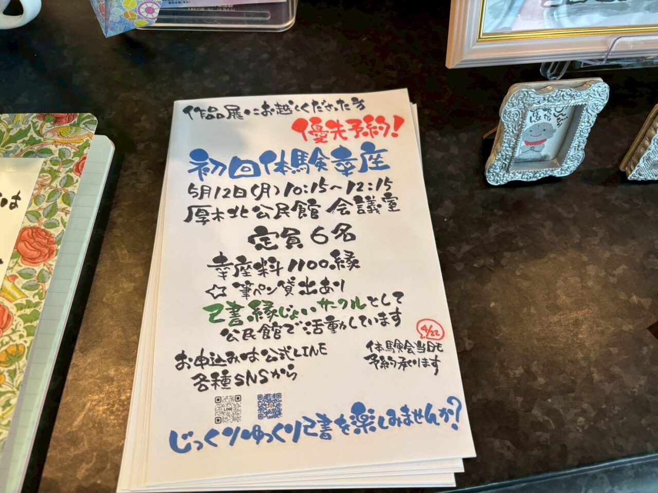 己書縁じょい道場は、5月から厚木北公民館で新たに己書幸座を開催します。初回体験幸座は、作品展に来てくださった方が、優先予約ができます。2025年5月12日(月)10:15~12:15 厚木北公民館会議室にて、定員6名で開催します。お申し込みは、公式LINE又は、Instagramからお申し込みください。