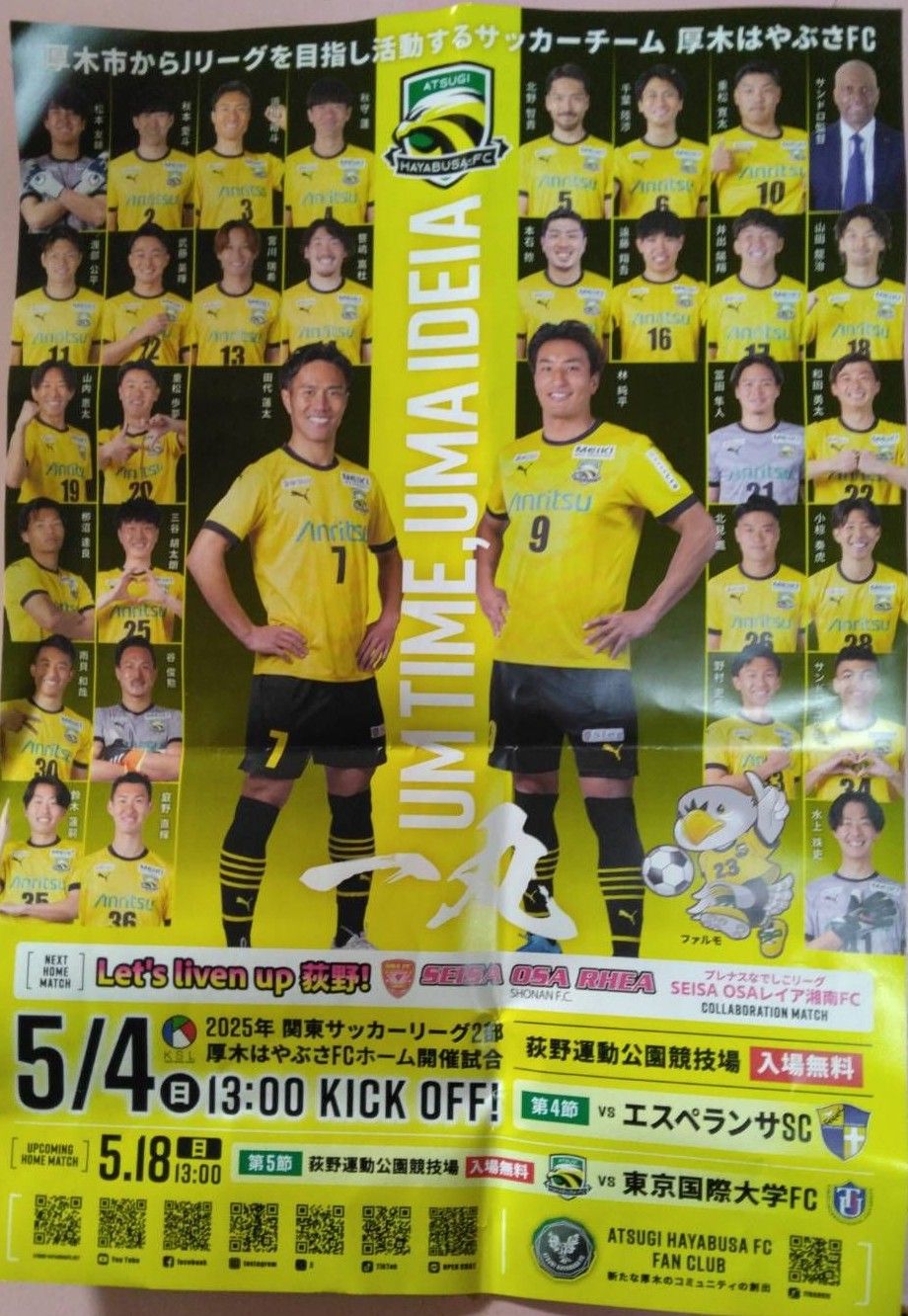 5月4日(日)、荻野運動公園にて13時キックオフで開催される関東サッカーリーグ2部第4節(vsエスペランサSC)のイベント情報をお知らせいたします。