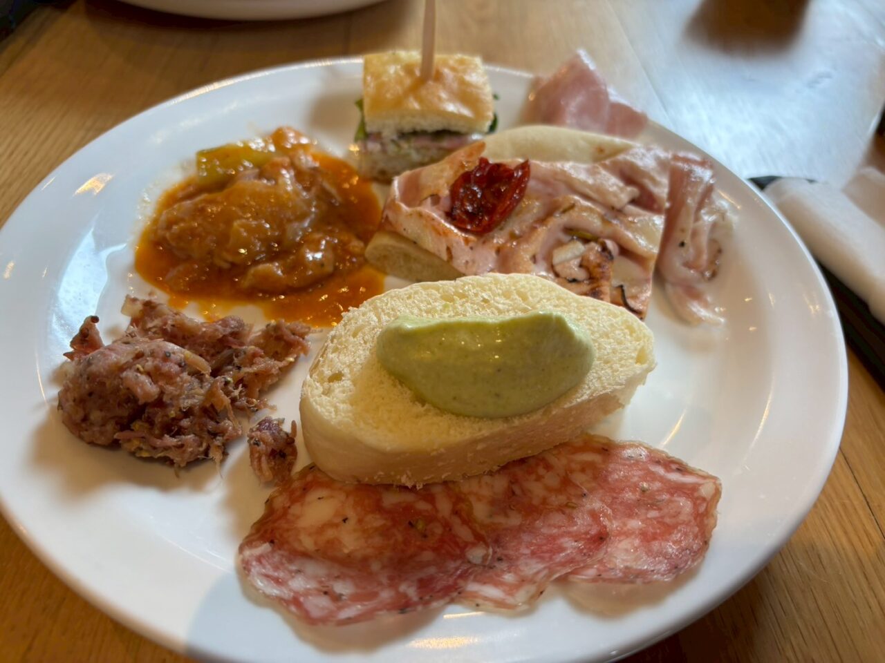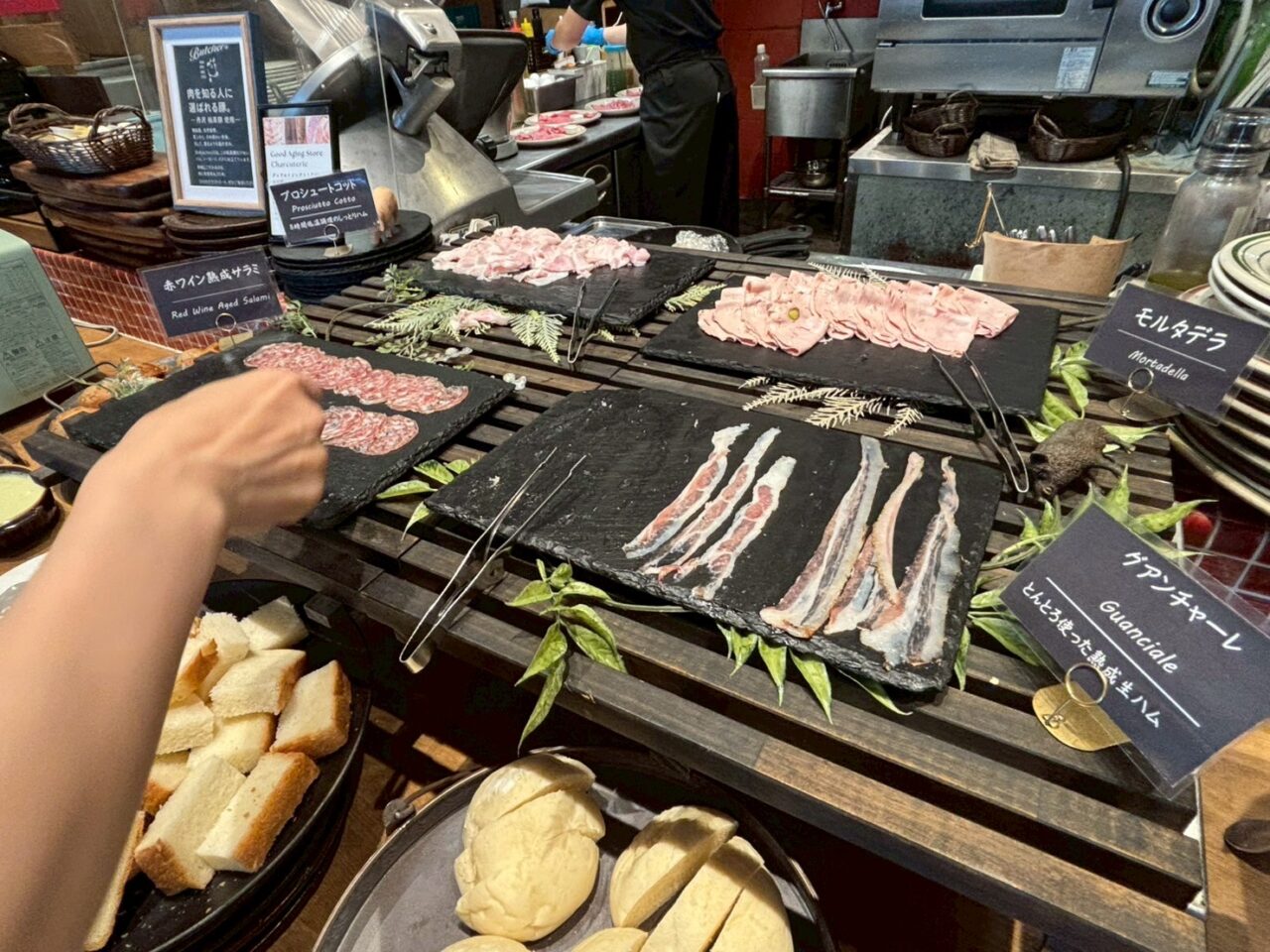 DA Butchersの自家製シャルキュトリーが食べ放題とは贅沢! モルタデラ・グアンチャーレ・赤ワイン熟成サラミ・プロシュートコットがお皿に並んでいてこれが食べたくてランチブッフェに来ました!
