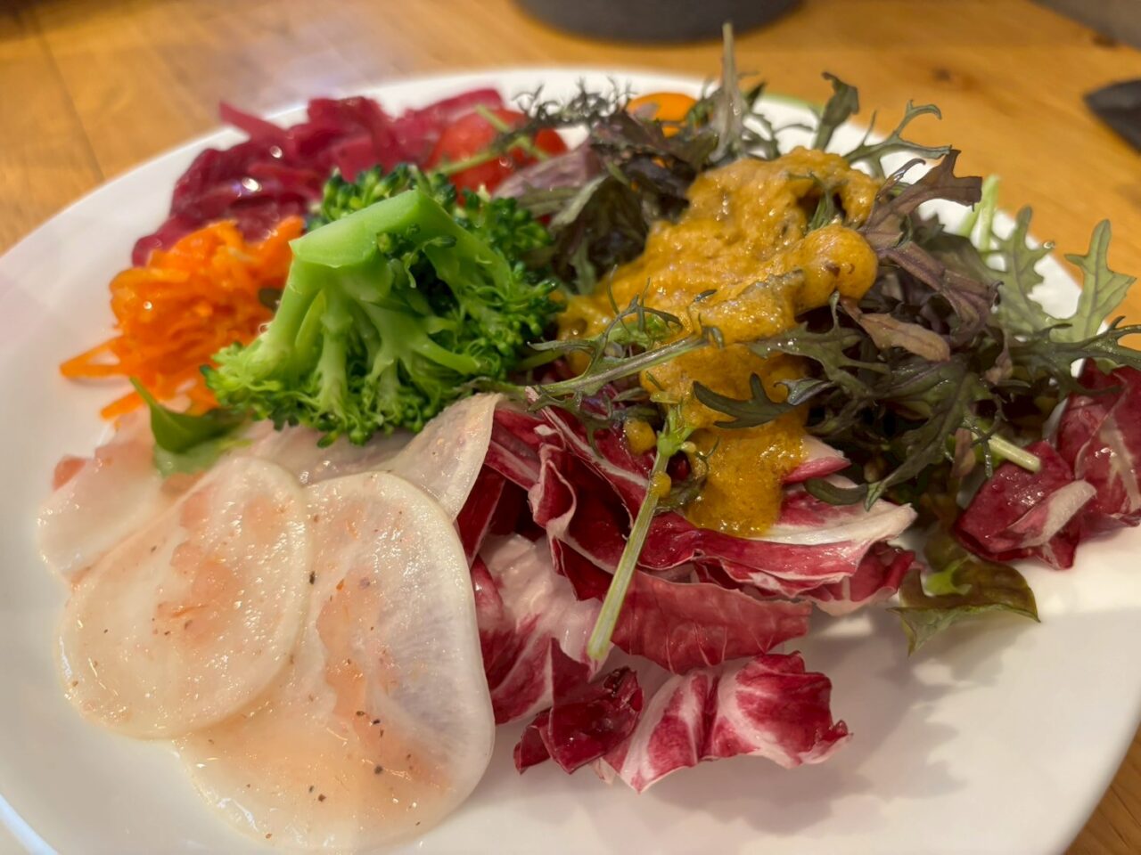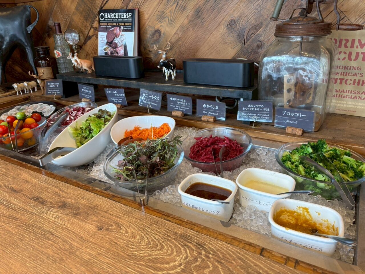 お野菜の種類は、ブロッコリー、赤からし菜、サニーレタス、カラフルトマト、ラディッキオ、塩麹でマリネしたキャロットラぺ、カブのカルパッチョ、ドレッシングは、ブッチャーズソースとマスタードドレッシング、おろし醤油ドレッシングがあります。