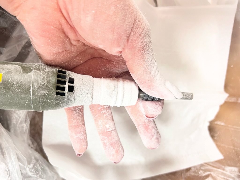 Mikke mineイニシャルキーホルダーは、店主が粉まみれになって研磨(削る作業)をしています。一つ一つ丁寧な作業ののち、つるつるした、ぷくっとした肌触りの綺麗なイニシャルキーホルダーが出来上がります。