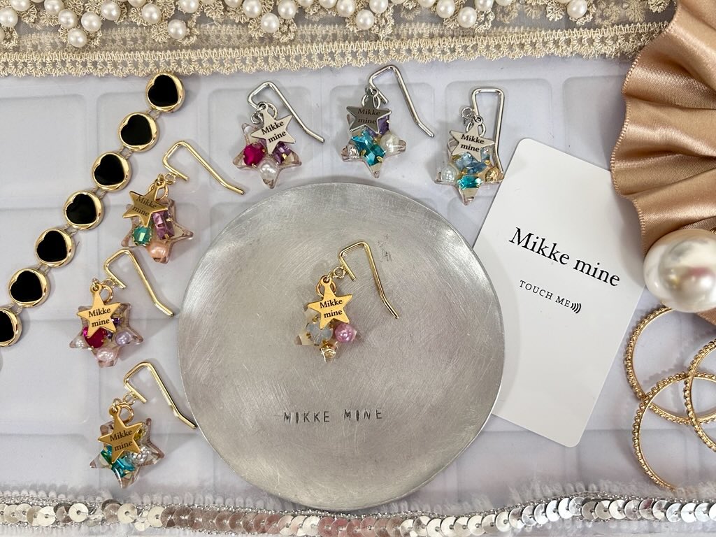 販売アイテム:イヤリング、ピアス、ヘアゴム、ブローチ、アンブレラマーカー、ボールペン、ポニーフック、ネックレス、イニシャルバッグチャーム、Mikke mine刺繍入りジッパーケースなど