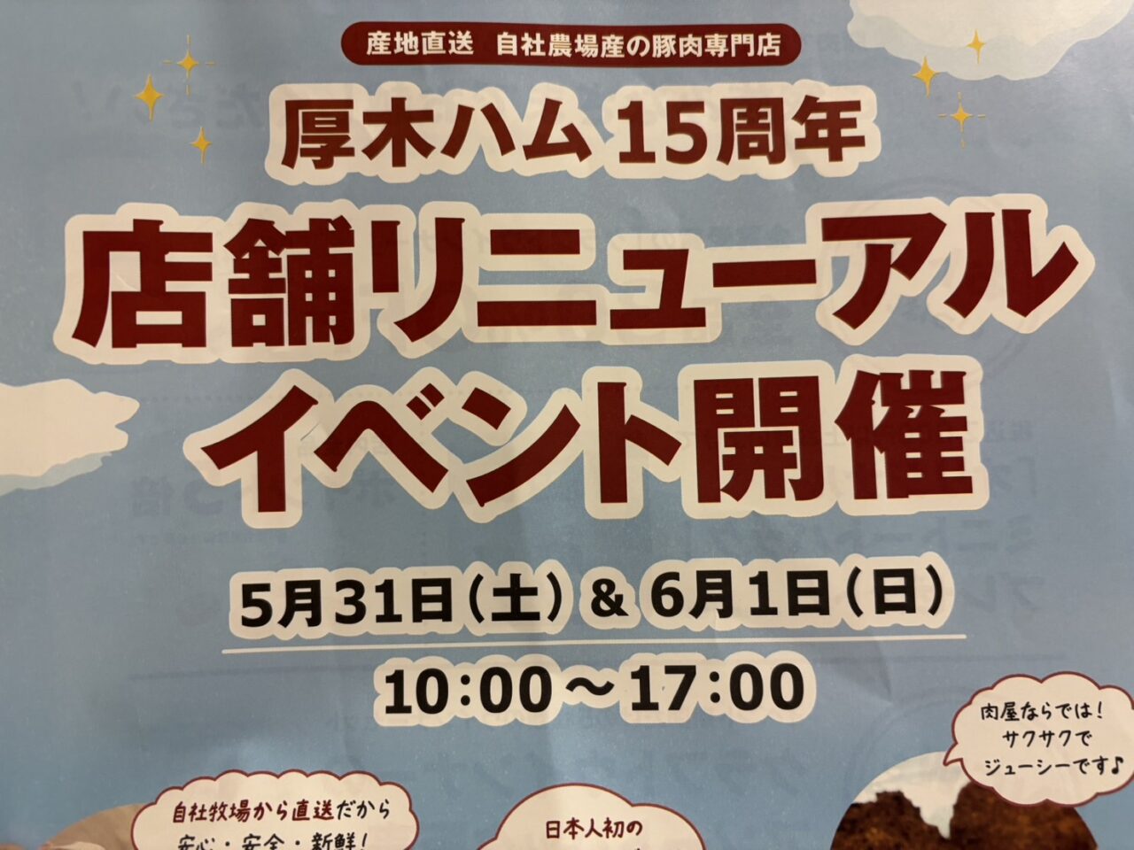 店舗リニューアルに向けて、店舗工事の為、店舗営業は2025年5月29日(木)、30日(金)お休みとなります。また、5月31日(土)は、厚木ハム15周年を迎えます。