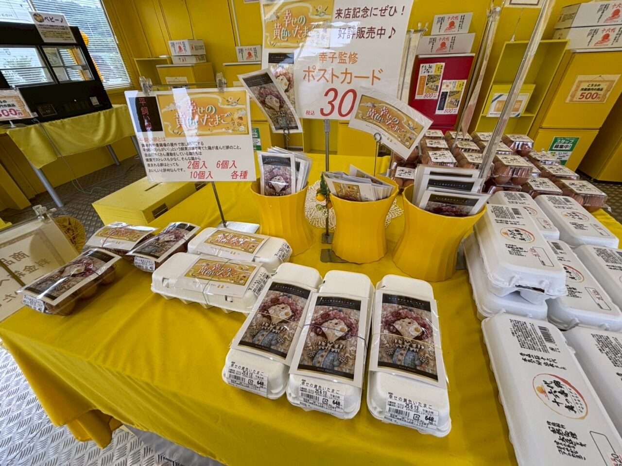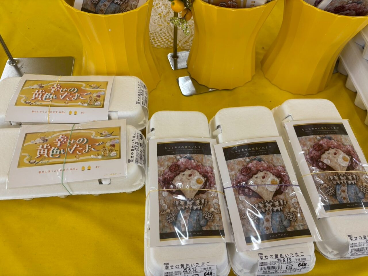 よく見ると、幸せの黄色いたまごには、ヤマモトヤ社長幸子さん監修の政木 アニーが描いたポストカード付です。