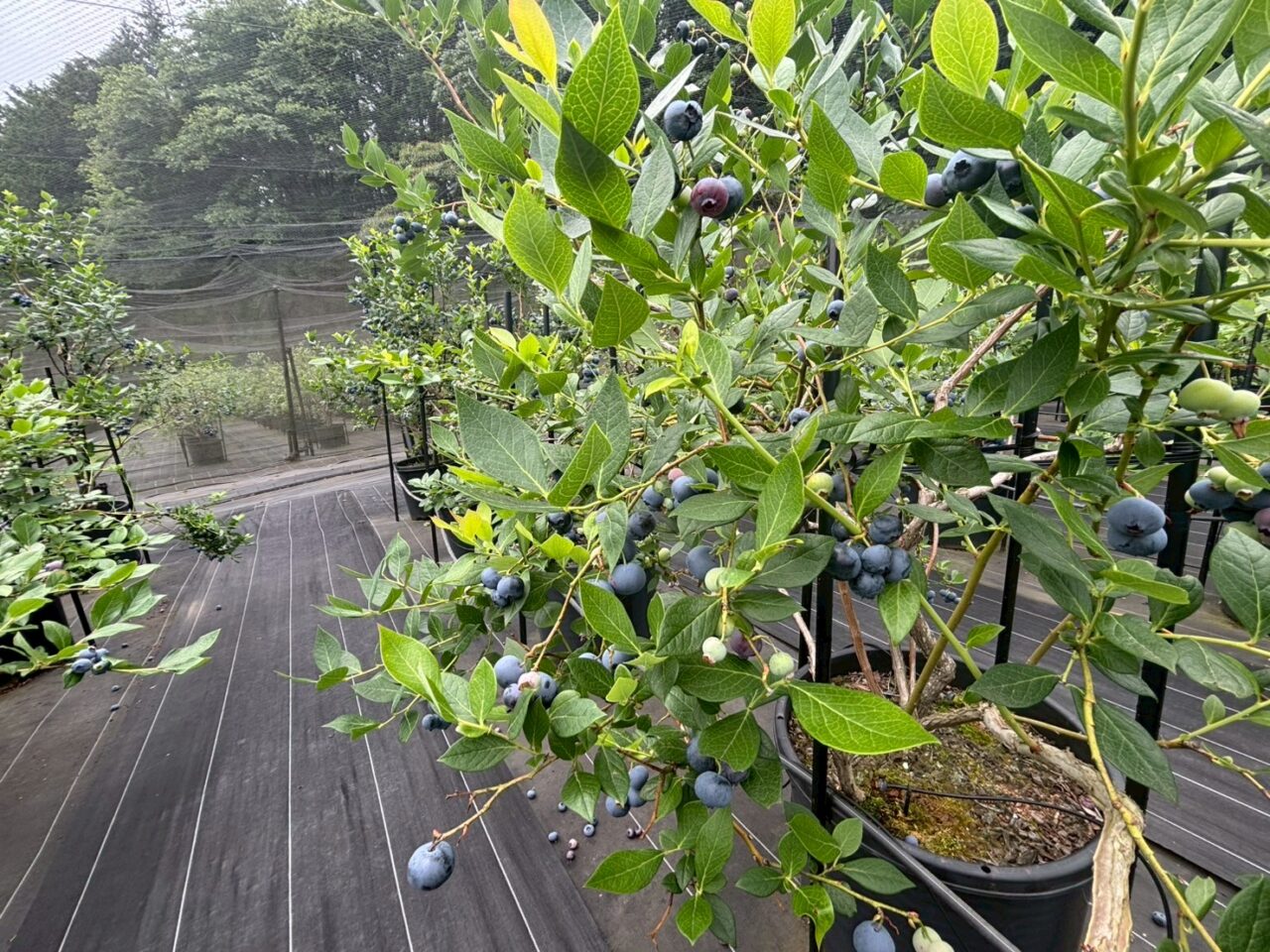 美味しさを引き出せるやり方で育てているブルーベリーは、品種によって、100円玉くらいの大きさのものがたくさん実っています。