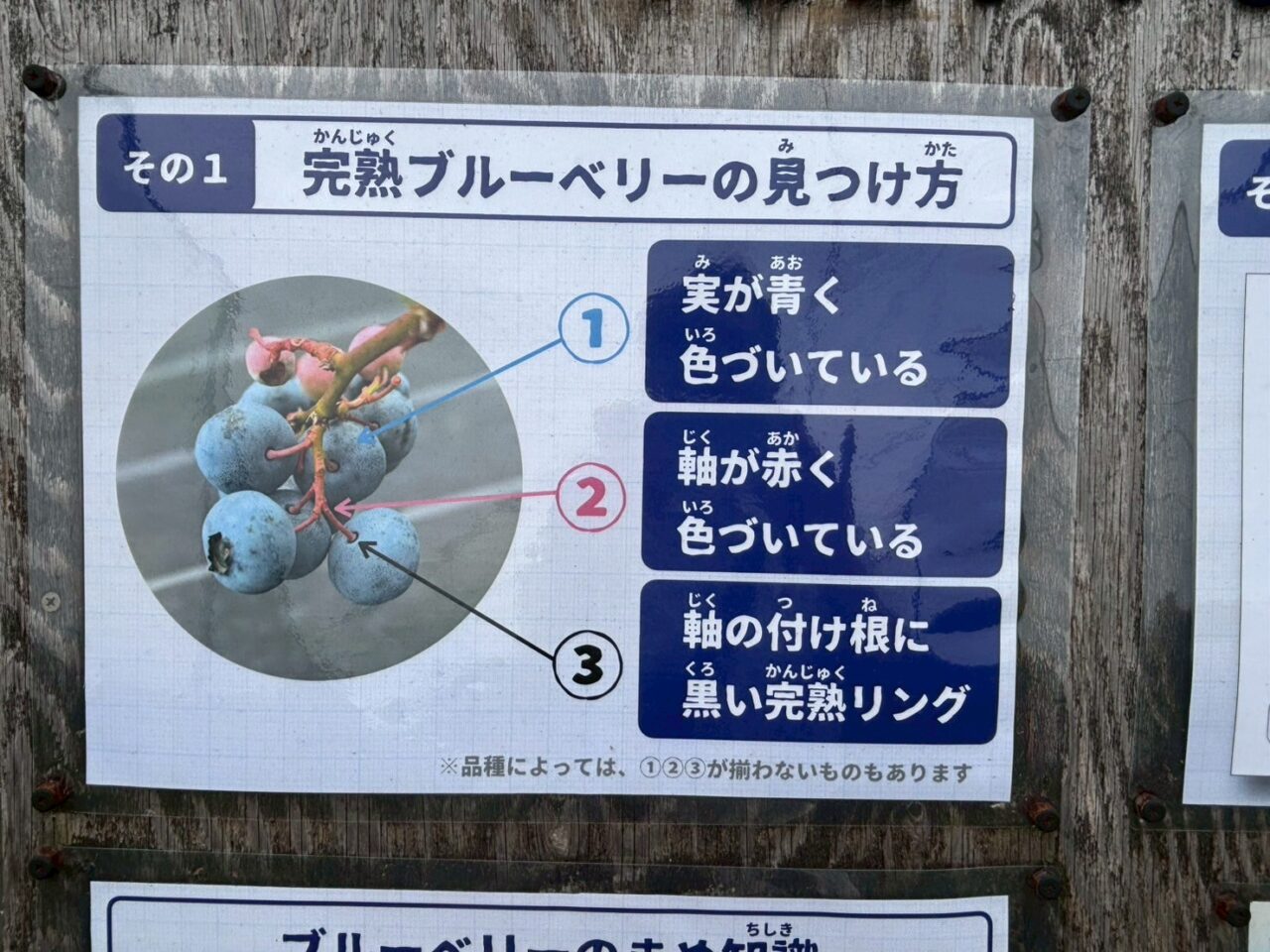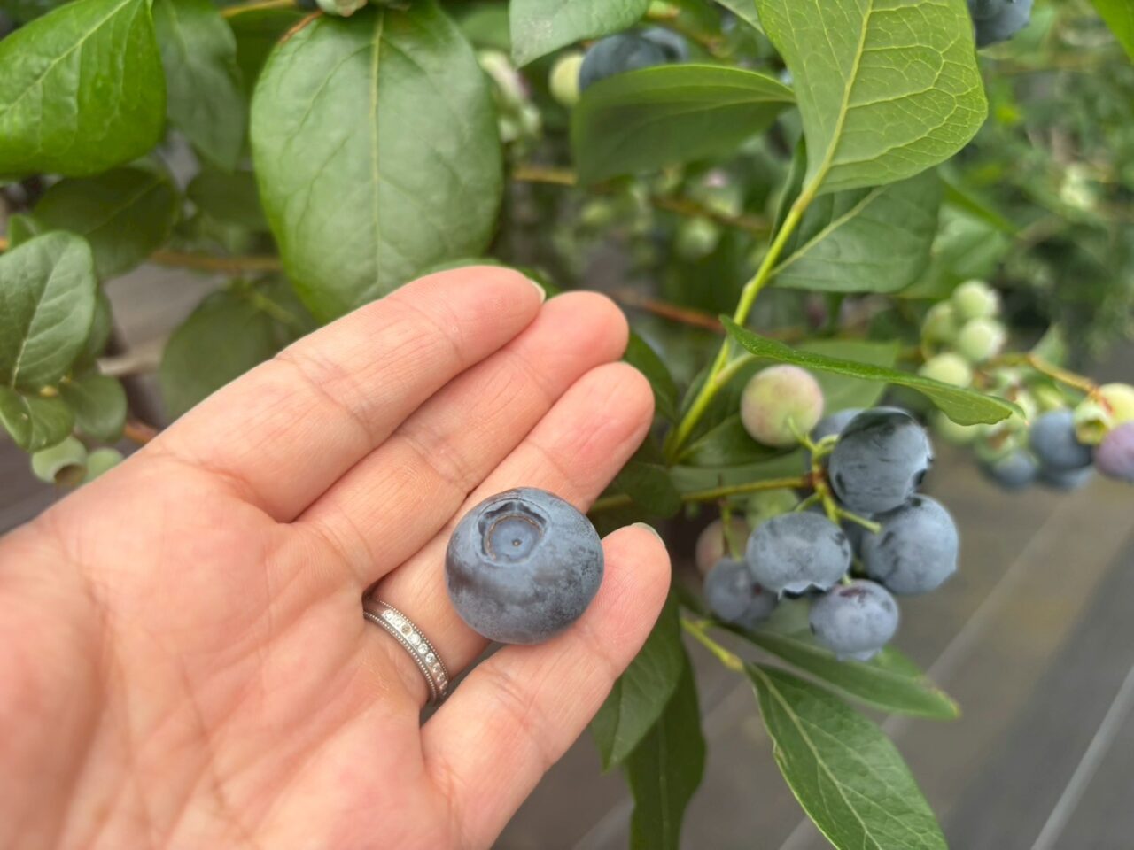 完熟ポイントは、ブルーベリーは一粒一粒が熟していきます。見極めるポイントは 実が青く、軸の付け根に黒いリングが出来ているもの(完熟リング)。完熟していると指でぽろっとブルーベリーがとれます。