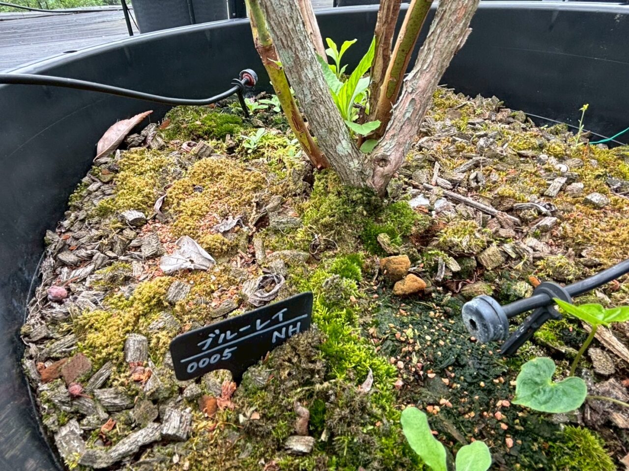 農園のブルーベリーの美味しさの秘密は、鉢植えの栽培です。ブルーベリーはもともと北米が原産です。美味しさを引き出すため、酸性の土で、美味しく育てようと根っこの環境を北米に近づける必要があります。鉢の中には、スポンジ状のものが入っていて、ブルーベリーが好きな栄養を、ぽたぽたとあげています。そういう状態を作ることでおいしいブルーベリーがたくさん実ります。