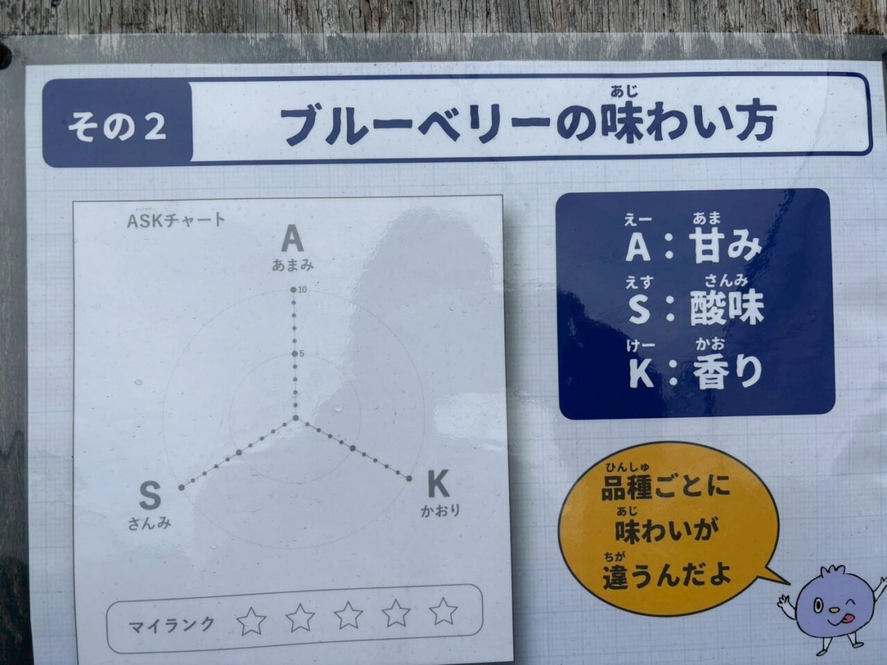 渡辺さんよりブルーベリーの味わい方をお伺いしました。甘み、酸味、香りを感じながら食べてほしいそうです。「10倍おいしくなるノート」を使うと、品種ごとに三角形が違う形になってくるので、違いを分かるようになると、より深くブルーベリーを味わうことが出来ます。