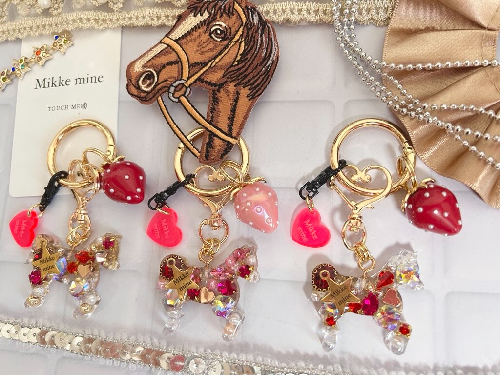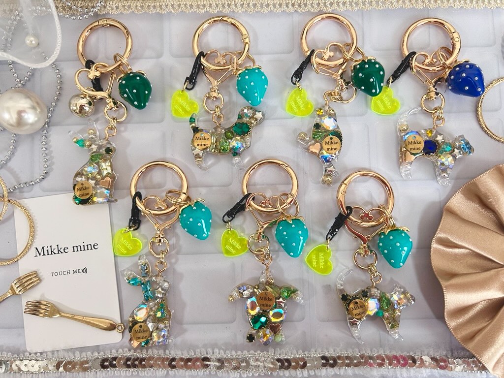 こちらを目指してくるお客様も多いのではないでしょうか。キラキラした豪華バッグチャームは、可愛さ爆発していますね! Mikke mineプレートもついて特別感があり、一つ一つ色合いも組み合わせも、形も唯一無二のアイテムです。自分のお好みを見つけてくださいね。
