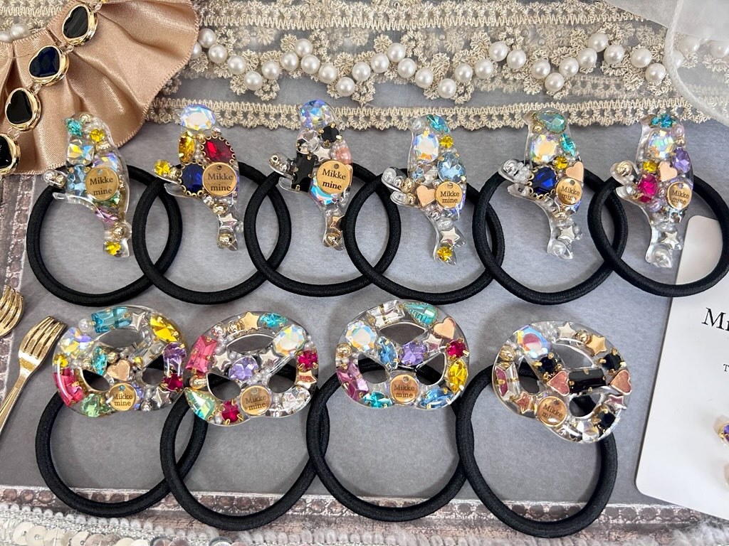 大切に使いたくなるどこにもない豪華なキラキラヘアゴムには、Mikke mineプレートが入れてあります。ウサギに、ちょうちょに、インコに、プレッツェル、カメ、ハリネズミ、猫にぶた、どれも可愛くて身に着けてお出かけしたくなる可愛すぎるヘアゴムです。