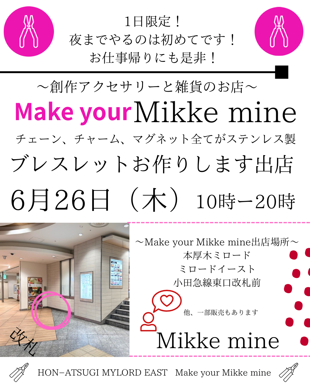 今回は、1日限りの出店となります。出店のテーマは「〜make your Mikke mine ブレスレットお作りします出店〜」です。