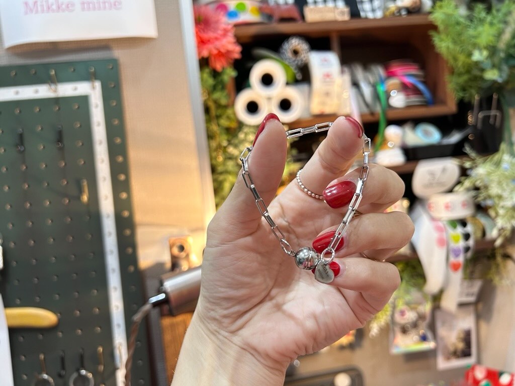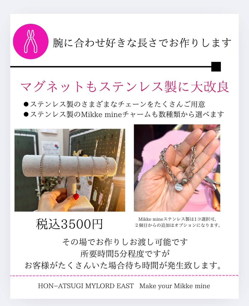 内容は、腕に合わせた長さで、お好きなステンレス製チェーンで、お好きなMikke mineステンレス製チャームで、初ステンレス製マグネットを使用したブレスレットを、その場で店主が作ってくれます。