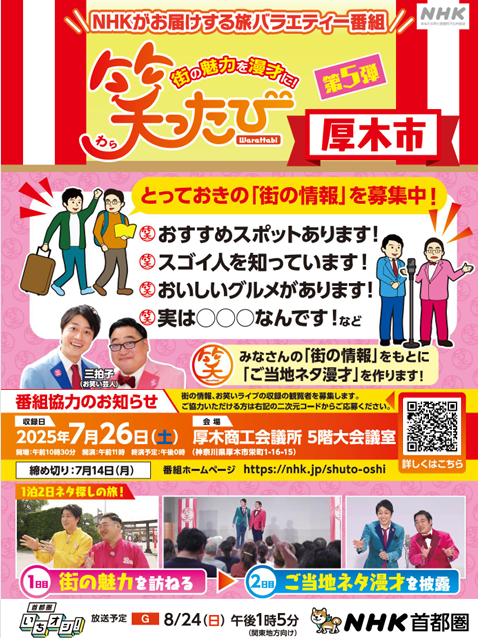 NHKがお届けする旅バラエティ番組「笑ったび」で、事前に地域情報を市民の方から募っています。ぜひ協力して、日本中の方に厚木の魅力をお伝えしませんか?また、お笑いライブの観客として参加しませんか?