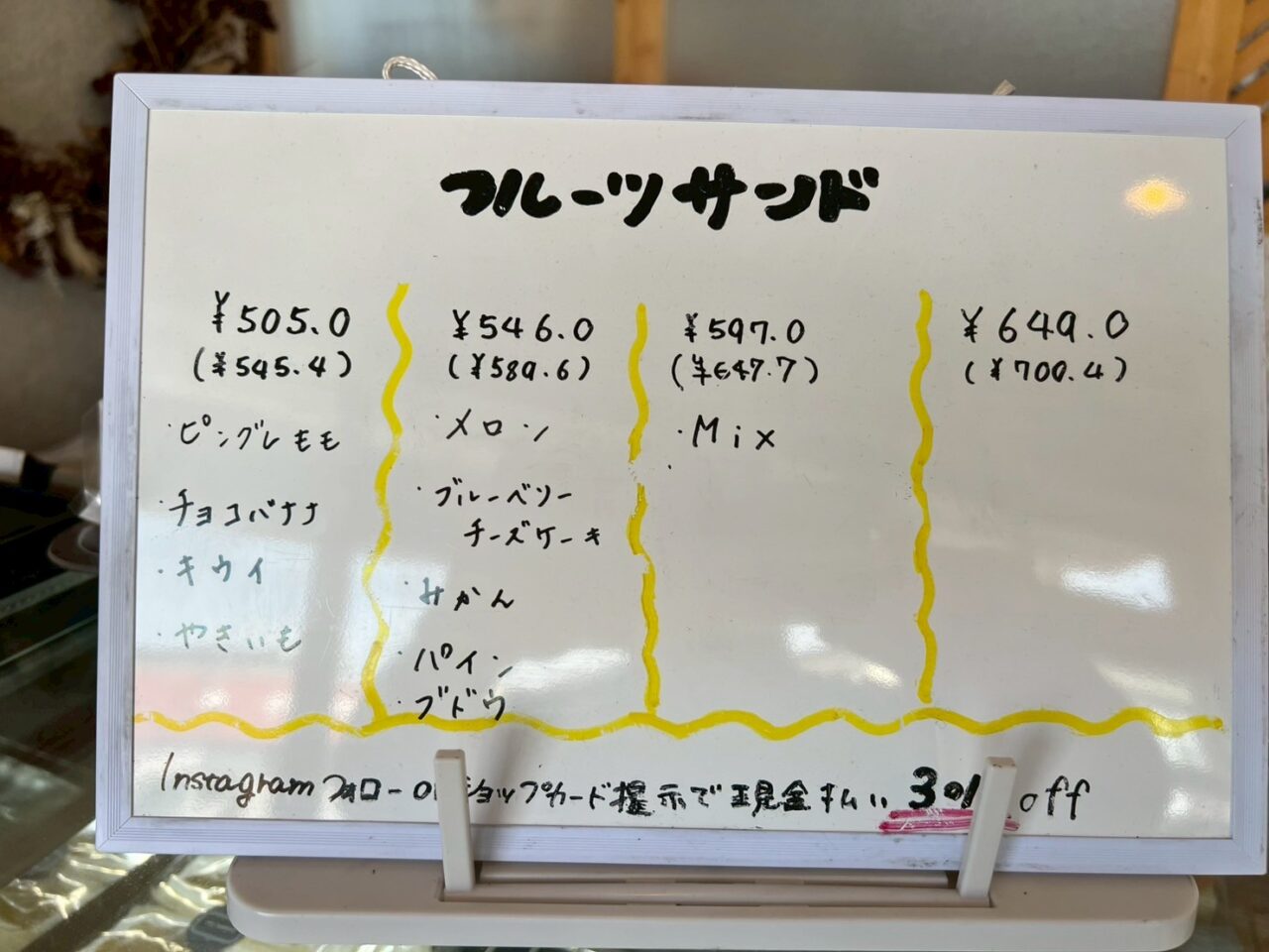 Instagramフォロー又は、ショップカード提示で現金払いの場合は、3%OFFです。