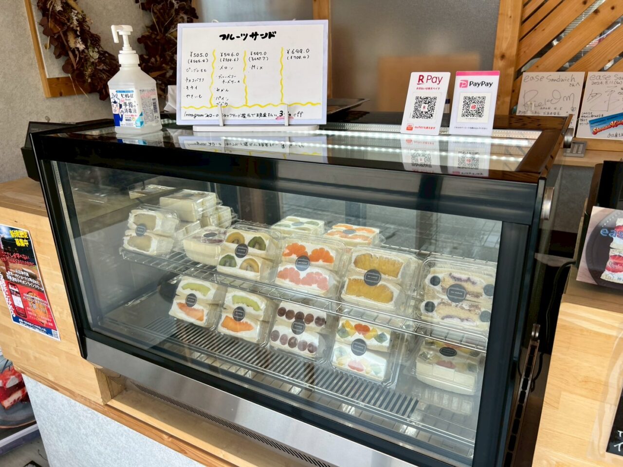 時期によって美味しいフルーツが入るフルーツサンド、定番のチョコバナナの他、パイン、ミカン、ぶどう、メロン、キウイなどのサンドイッチが並んでいます。断面が美しい。