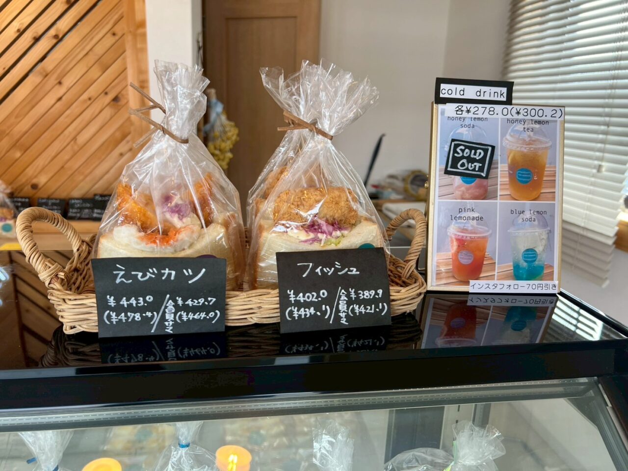 サンドイッチは日替わりもあり、毎日行っても楽しめます。定番のBLT、たまごサンド、BOXサンドのほか、サーモンアボカドクリームチーズサンドや、フィッシュやえびカツ、ローストビーフアボカドが並びます。