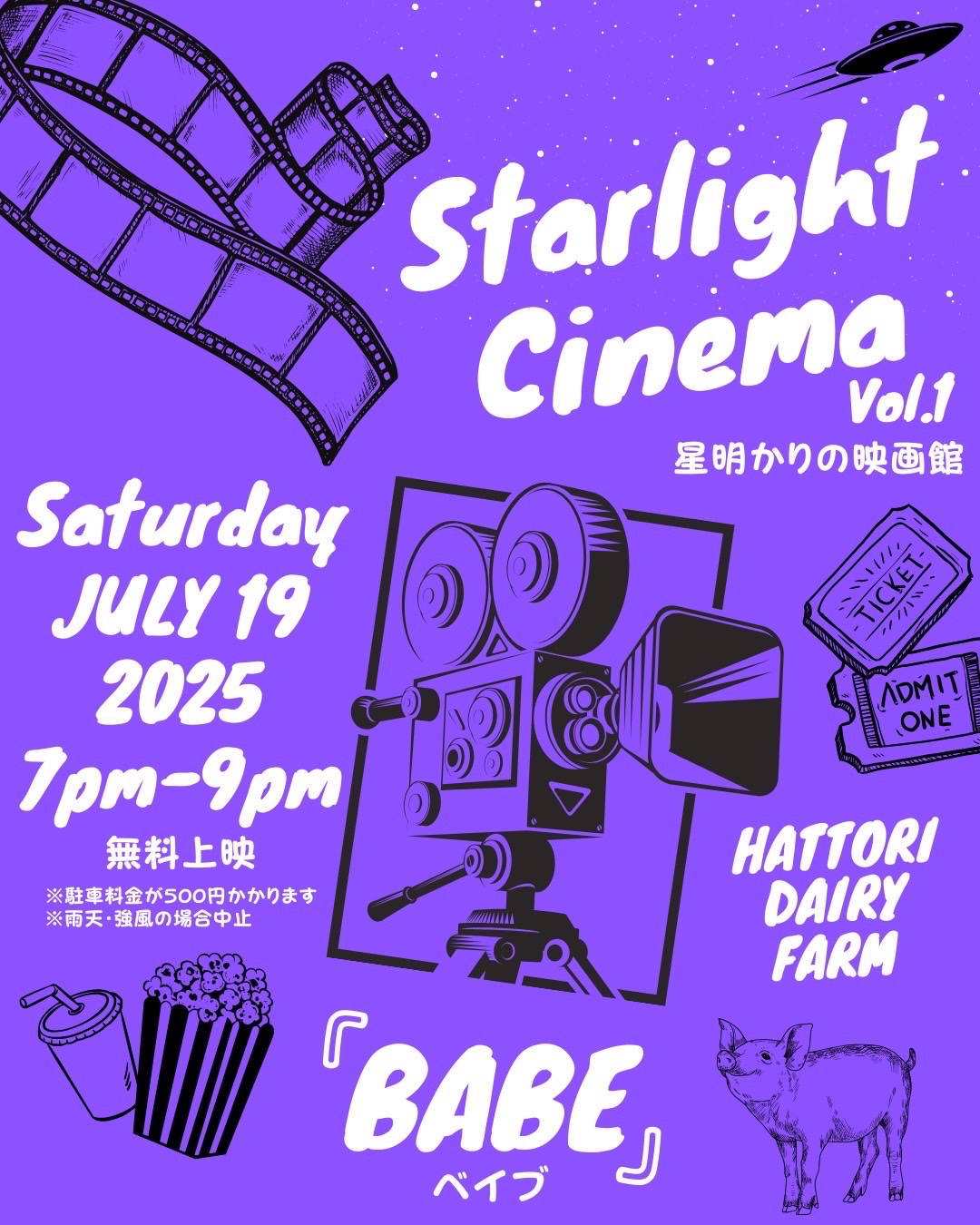 ❻ナイトシネマ上映「ベイブ」:こちらも服部牧場初の試み、夜の映画上映です。夜のまきばで観る感動の名作。晴れた夜には、星空の下で特別な映画体験をしてみませんか?