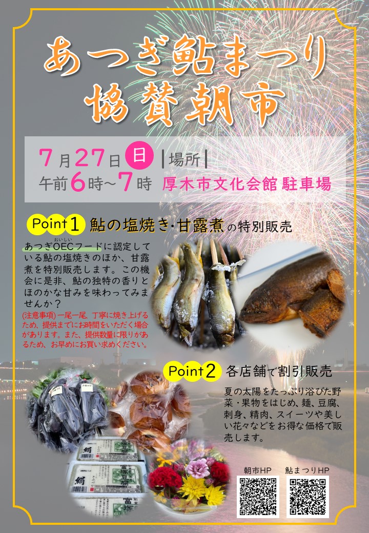 【厚木市】7月27日の朝市はお得がいっぱいの「あつぎ鮎まつり協賛朝市」です。鮎の塩焼き・甘露煮を特別販売します。