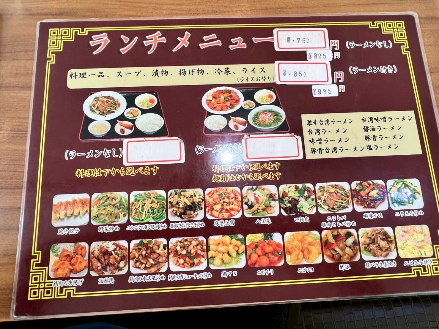 ランチメニューは、料理一品、スープ、漬物、揚げ物、冷菜、ライス(ライスお替り)で825円、ラーメンが付くと935円になります。