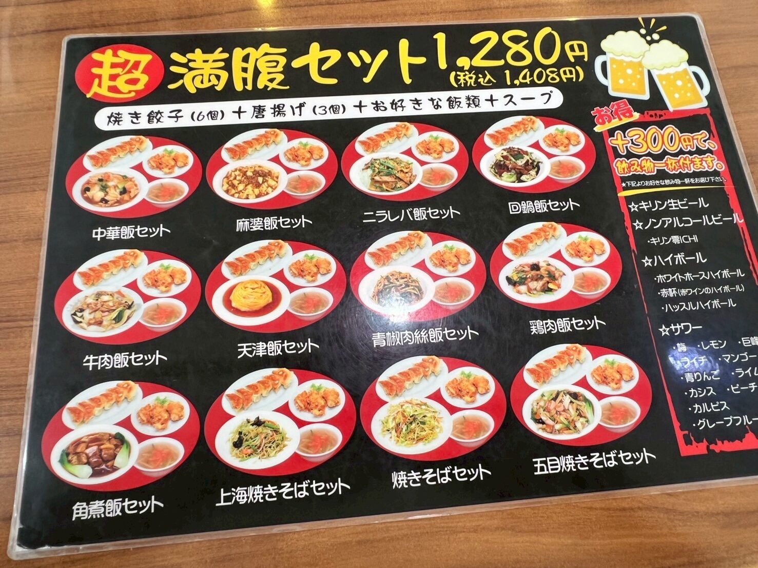 超満腹セットには、焼餃子(6個)+唐揚げ(3個)+お好きな飯類+スープで1408円です。