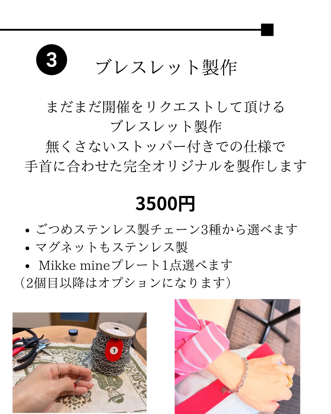 オーダーブレスレット製作をやります! これは筆者も愛用中ですが、無くさないストッパー付きの仕様で手首に合わせて作ってくれるので自分にピッタリのブレスレットが出来ますよ。