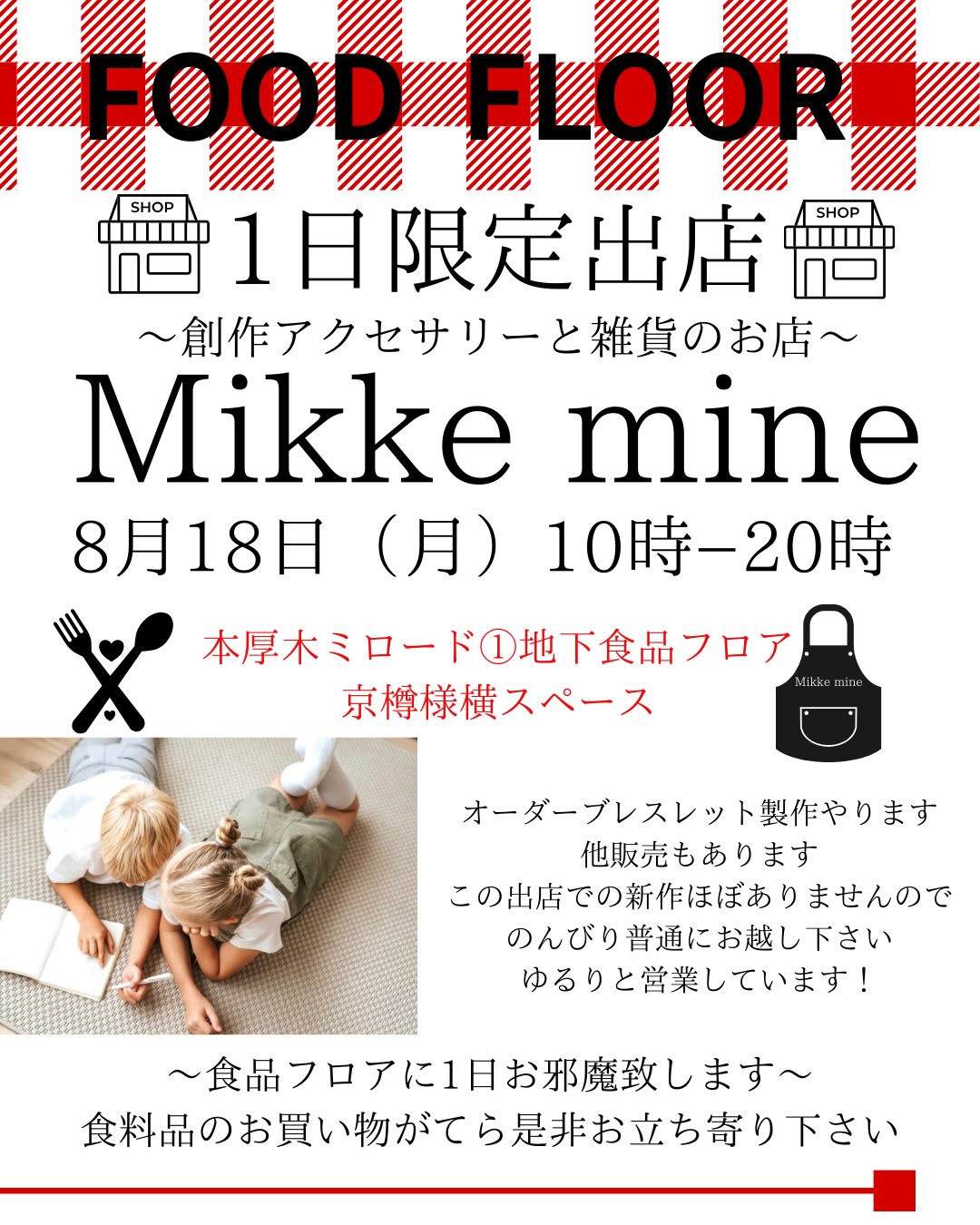 オリジナルのブレスレットやネックレスなど、自分のサイズに合わせて製作してくれる出店になっています。本厚木ミロード休館日前の出店となっています。食料品を購入がてら、ぜひ「Mikke mine」の世界観を覗きにきてみてください。