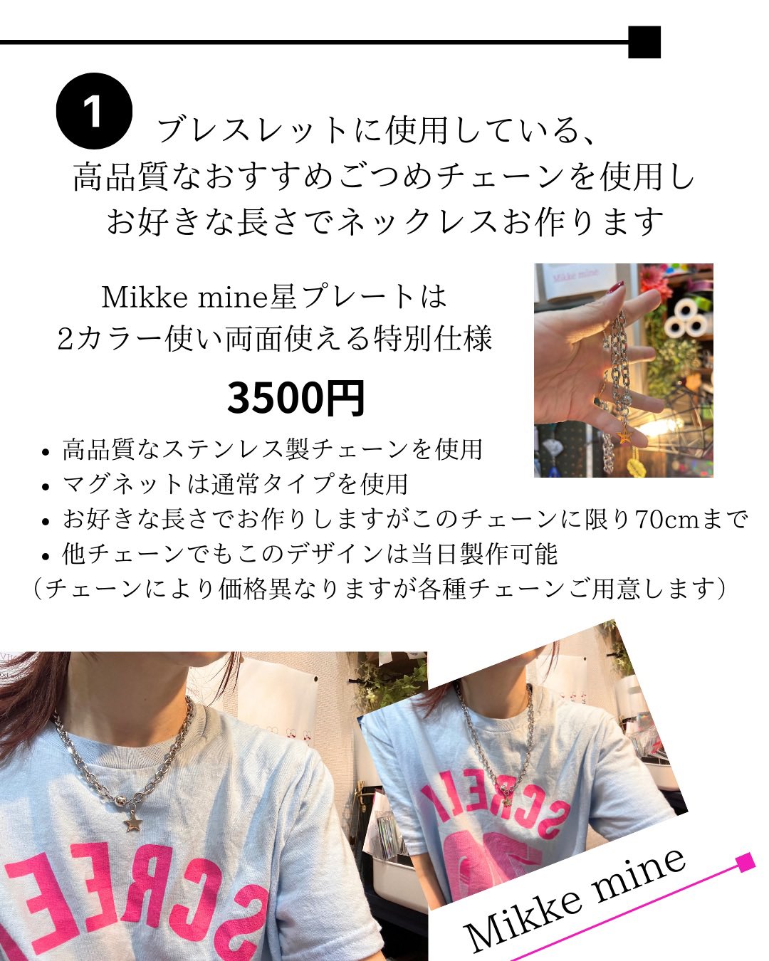 他、今回チェーン関連に関しては、その場で出来るものがある場合があるので、ぜひ店主に声をかけて完全オリジナルのアイテムを作ってもらってはいかがでしょうか。 ぜひ相談してみてください。