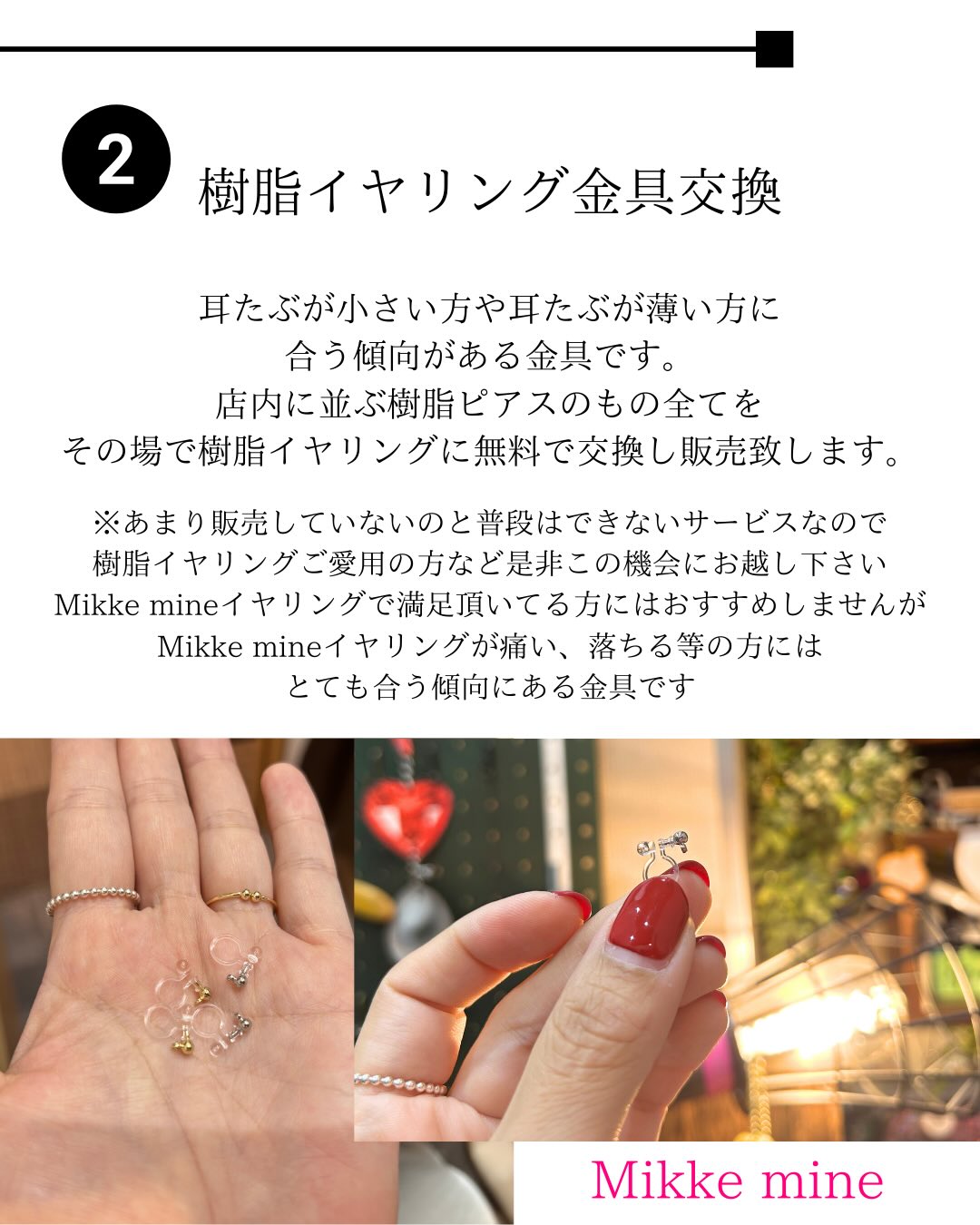 今回は、樹脂ピアスから樹脂イヤリングへの交換もします。店内に並ぶ樹脂ピアスのもの全てをその場で樹脂イヤリングに無料で交換し販売してくれます。