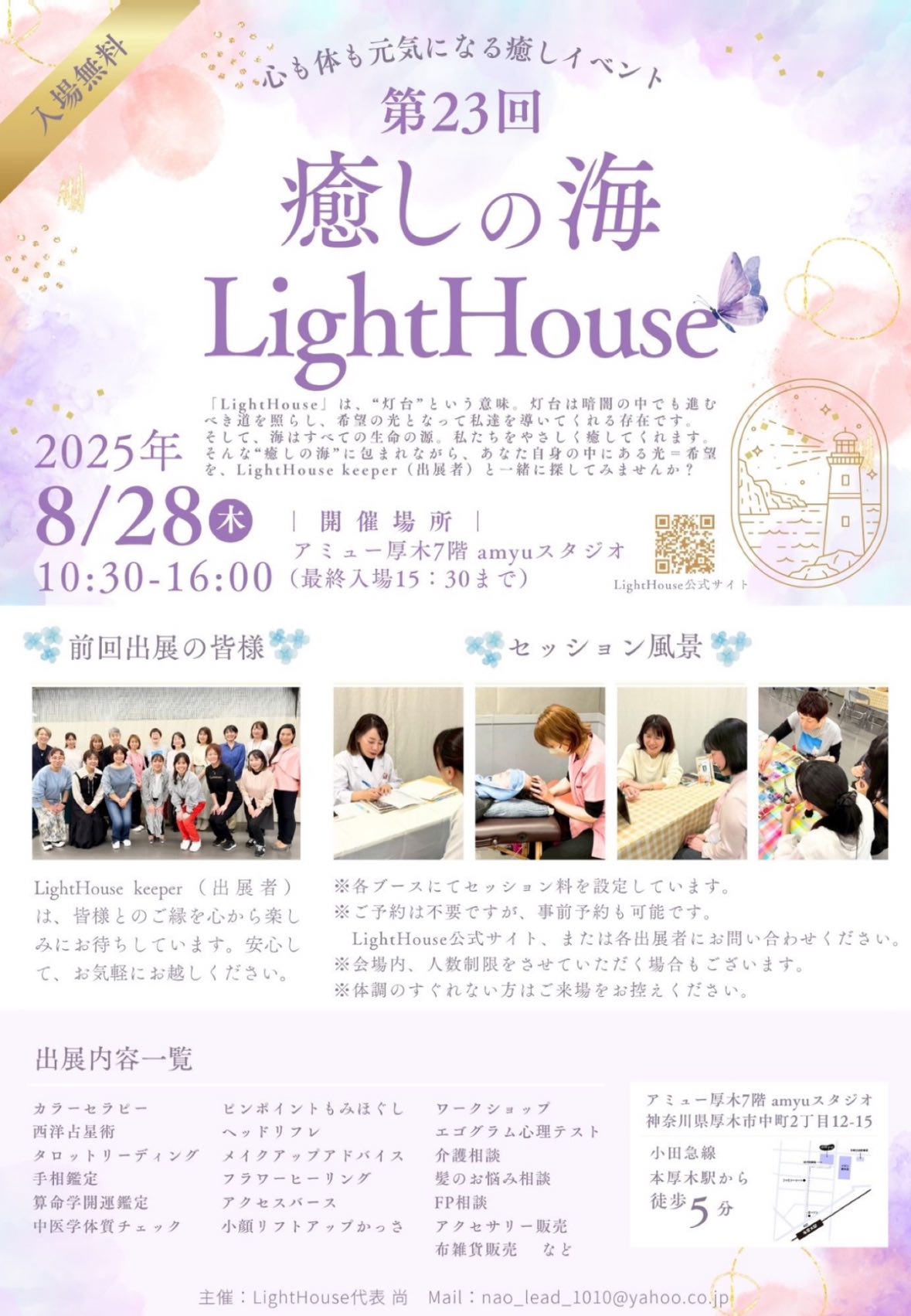 本厚木駅より徒歩3分、イオン厚木店の向かいの建物に「アミューあつぎ」があります。そのアミューあつぎ7階のamyuスタジオで、2025年8月28日(木)に心も身体も元気になる癒しイベント「癒しの海 Light House」が開催されます。