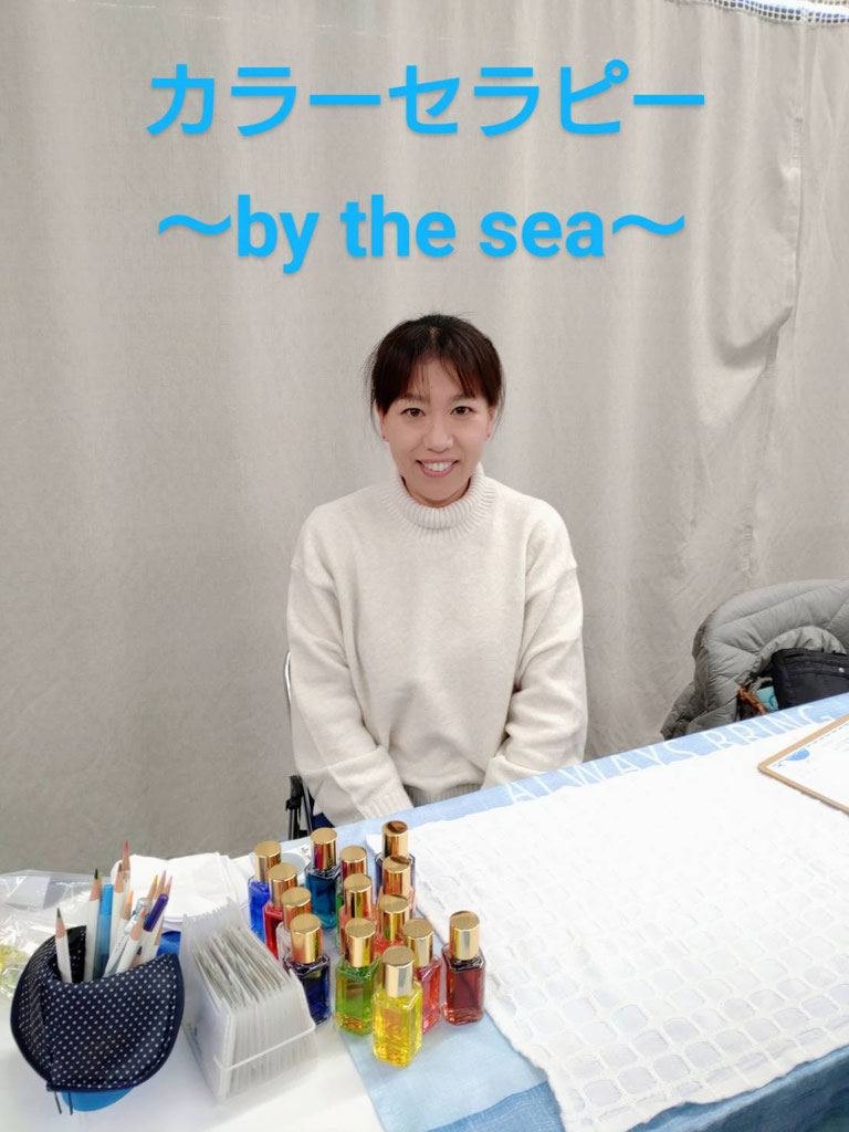 8月28日出店者様のご紹介をします。こちらは、「カラーセラピー by THE SEA マリン」14色のボトルを使ったカラーセラピーです。20分 2000円です。
