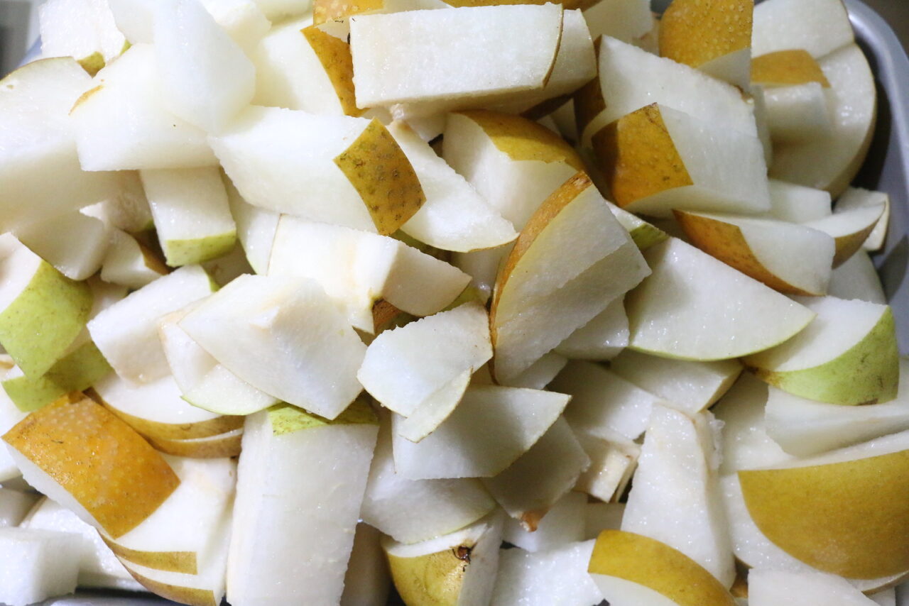 他にも風に揺られ枝と擦れて傷や割れがあったり、色や形(サイズ)にバラつきがあるなど、通常品としては売り物にならない梨を買い取って活用しています。