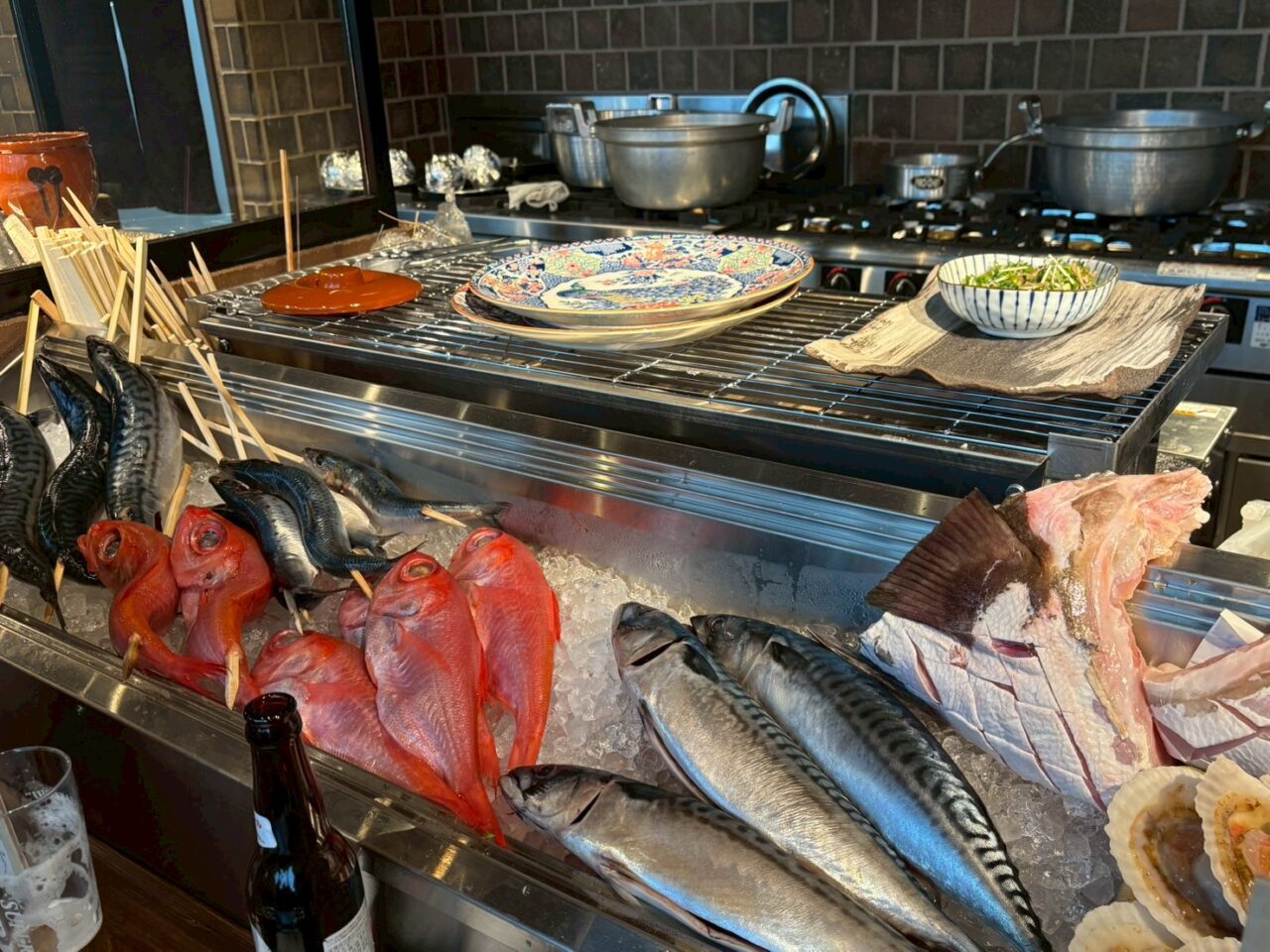 カウンタ―には、本日の新鮮な食材が並んでいます。好きな食材を炉端焼きで堪能してください。