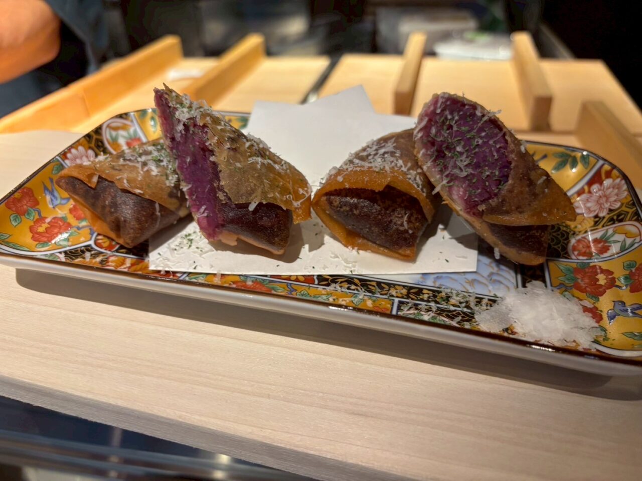 炭火で旬の野菜や魚介類を焼き、でき上がった料理を長いしゃもじ(掘返べら)で提供してくれました。