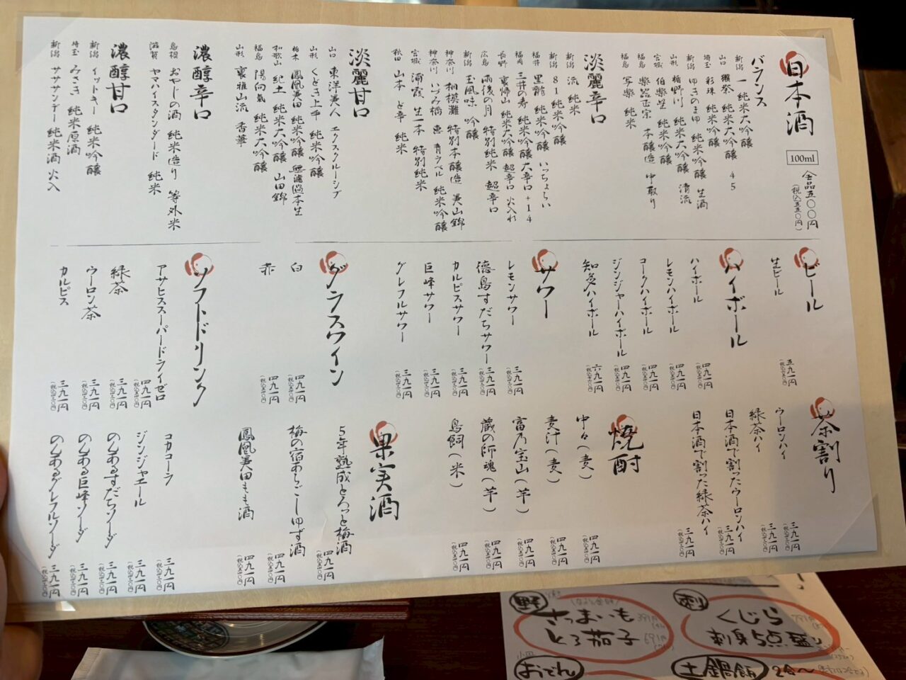 ドリンクメニューはこちら。日本酒のメニューが豊富!!お店の根本にある理念は「日本酒って楽しいを世界へ」を掲げていて、日本酒との相性が抜群のメニューが揃っています。