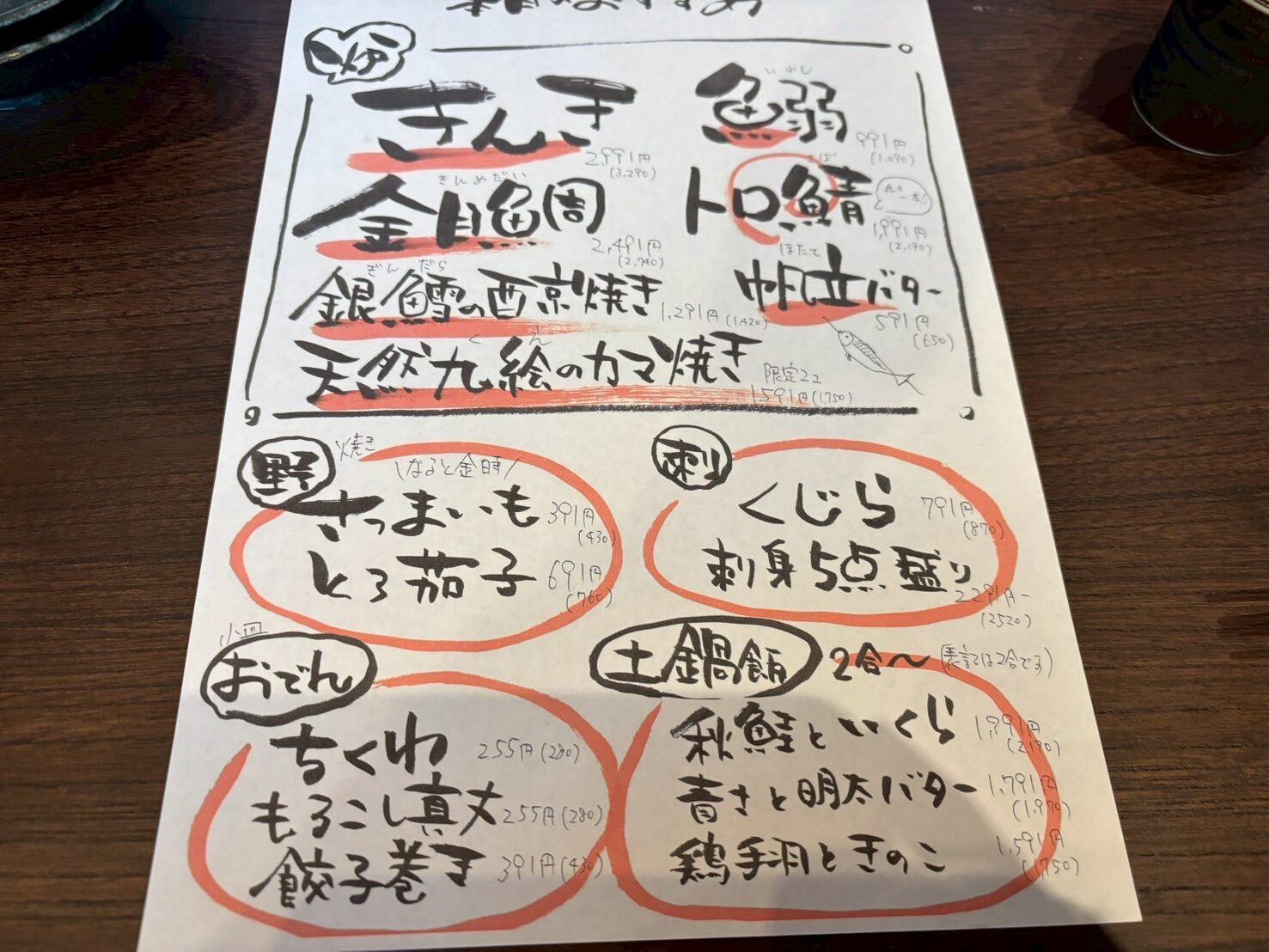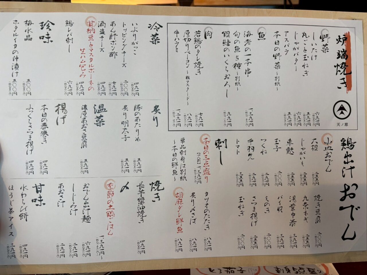 気になるメニューはこちら。店長さんにおすすめを聞いたところ炉端焼きと鶏出汁おでんと土鍋飯とのこと。