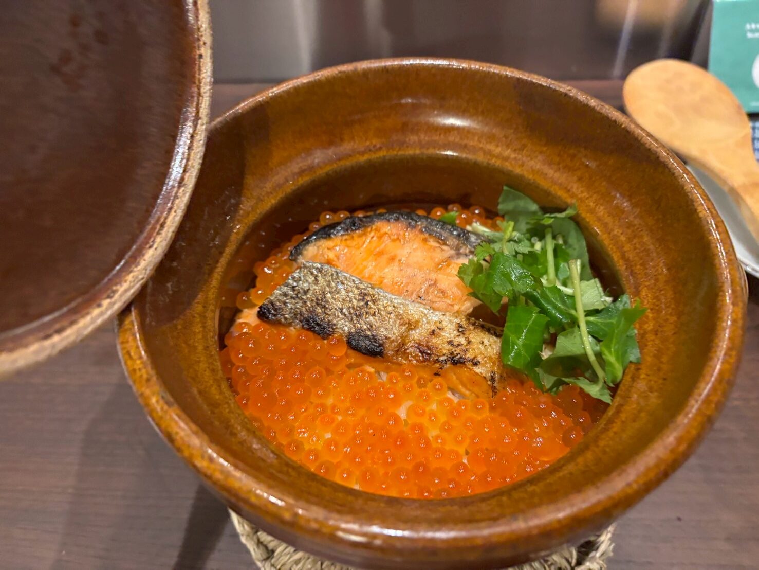 絶品の土鍋ご飯。こちらは秋鮭といくらの土鍋飯。2合から注文できます。余ったご飯は、持ち帰ることもできますよ。