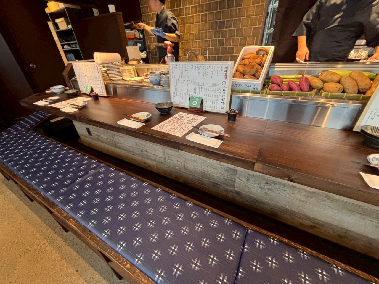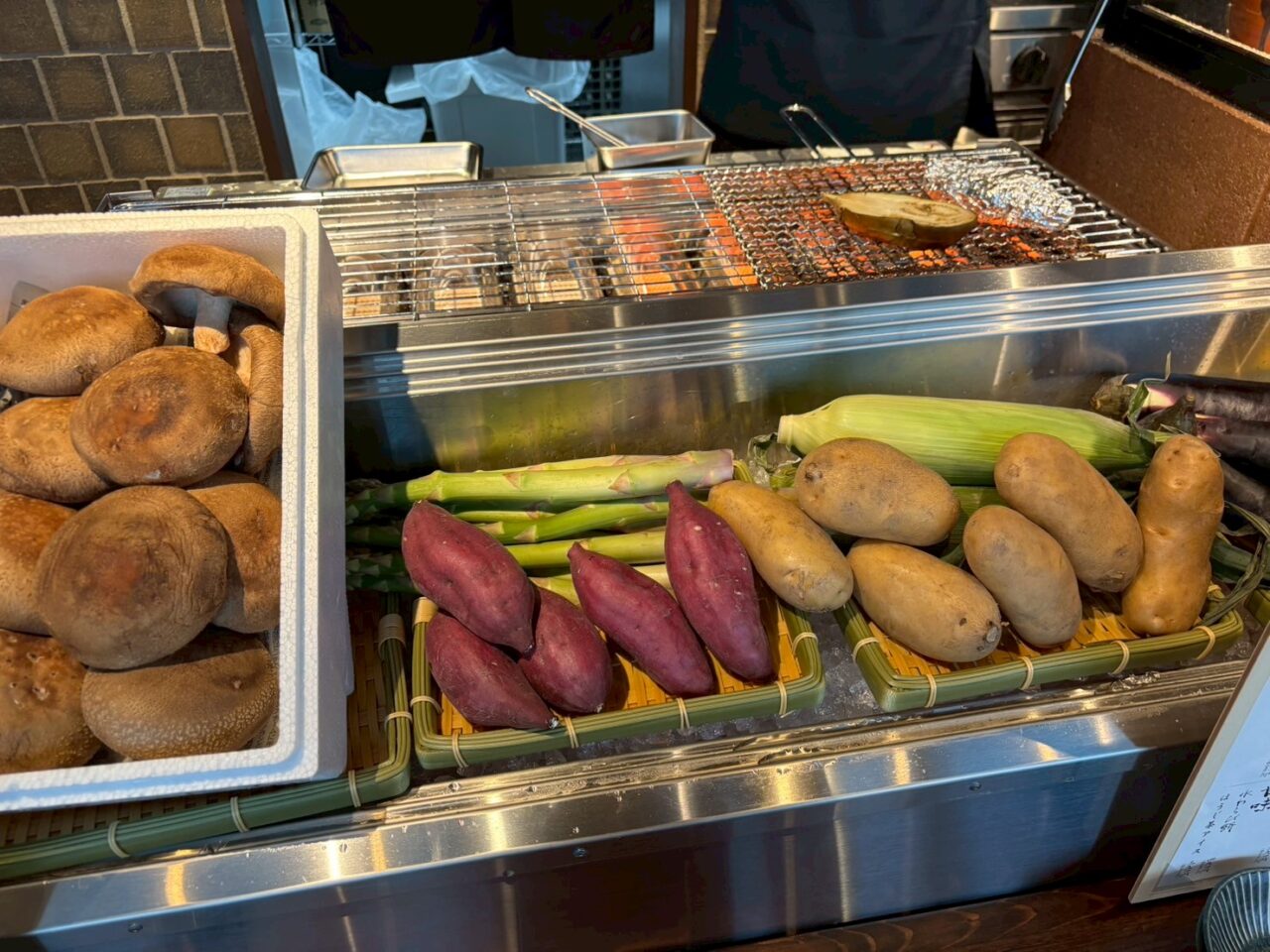 カウンタ―には、お野菜も並んでいます。目の前で焼いている姿を見ながら、四季折々の旬の食材を楽しめます。