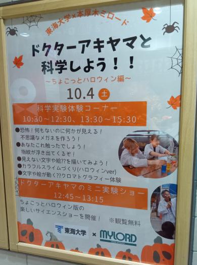 本厚木駅から直結の商業施設「本厚木ミロード」で、2025年10月4日(土)「ドクターアキヤマと科学しよう!~ちょこっとハロウィン編~を開催します。