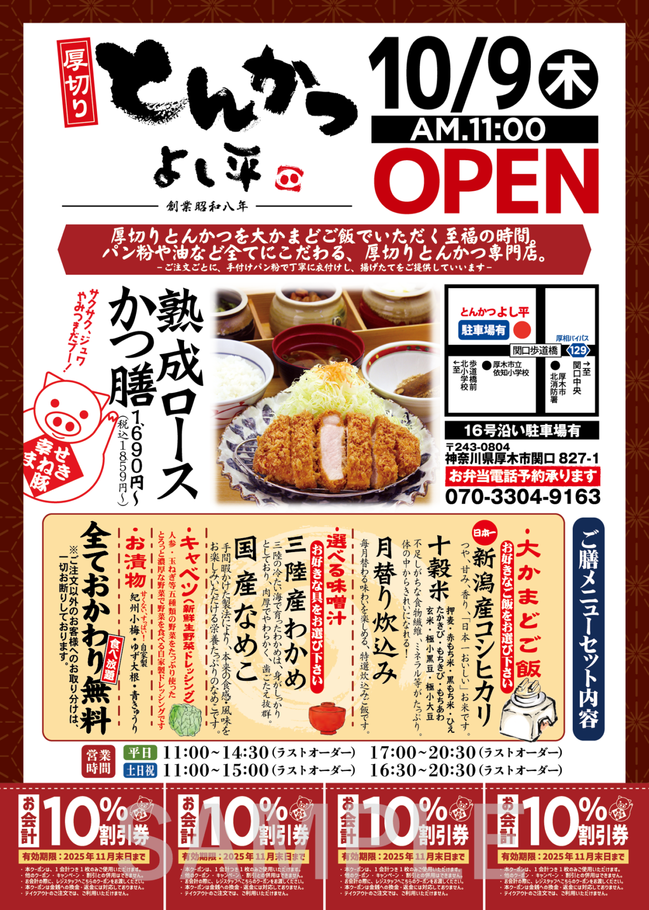 【厚木市】ご膳メニューを注文すると 「大かまどごはん」 「味噌汁」 「キャベツ」「お漬物」すべておかわり無料の「厚切りとんかつ よし平」が10月9日オープン!