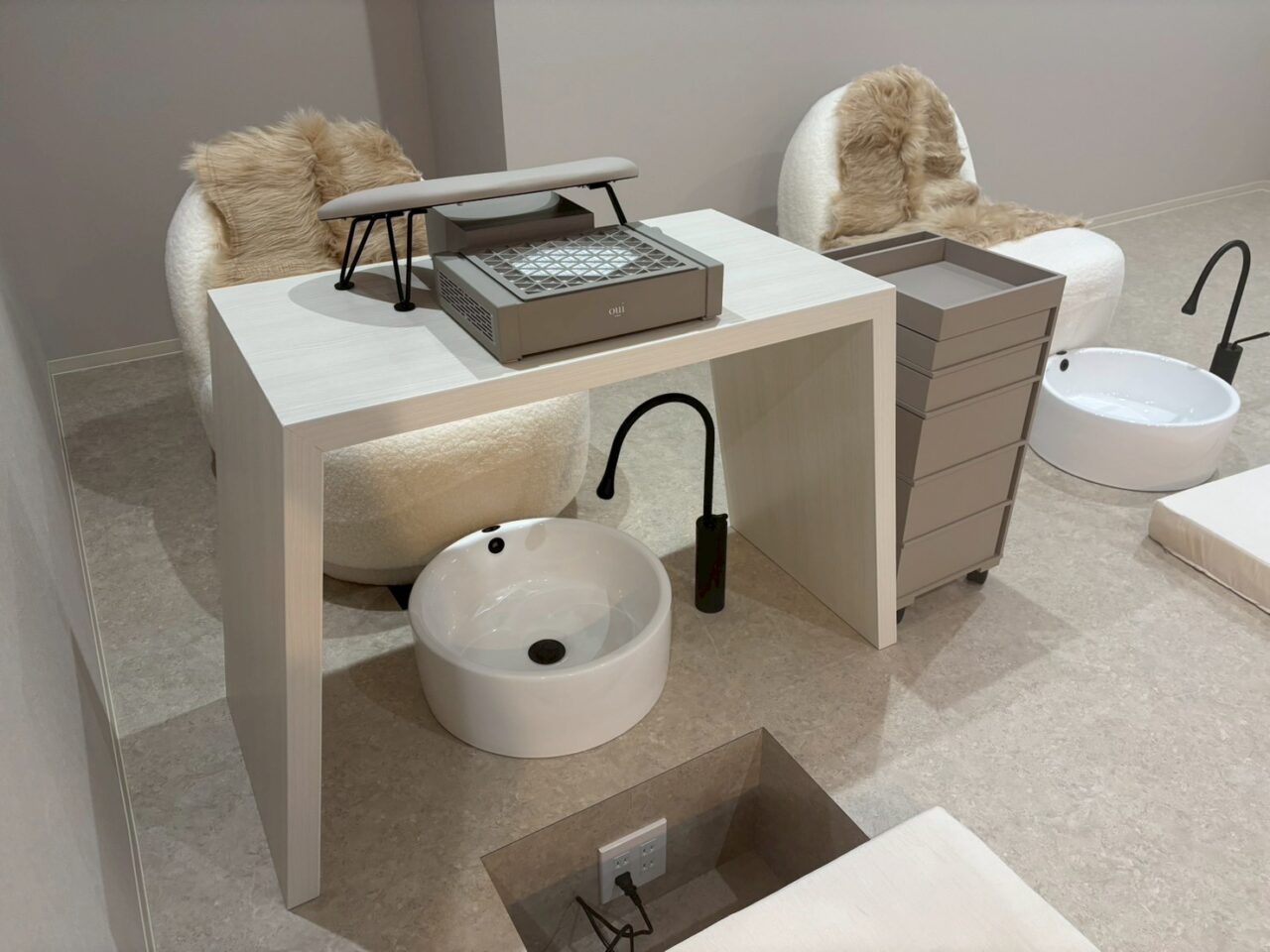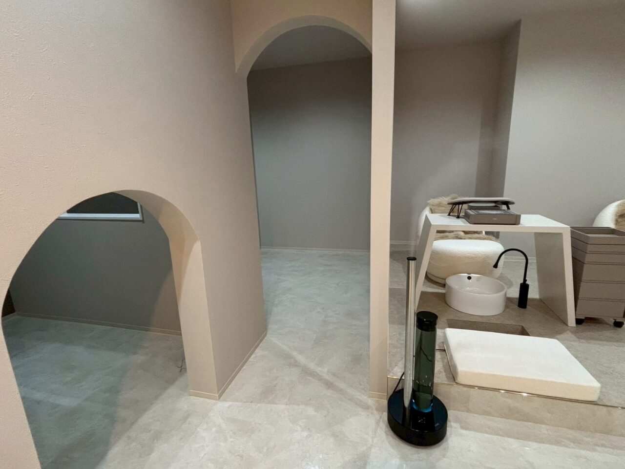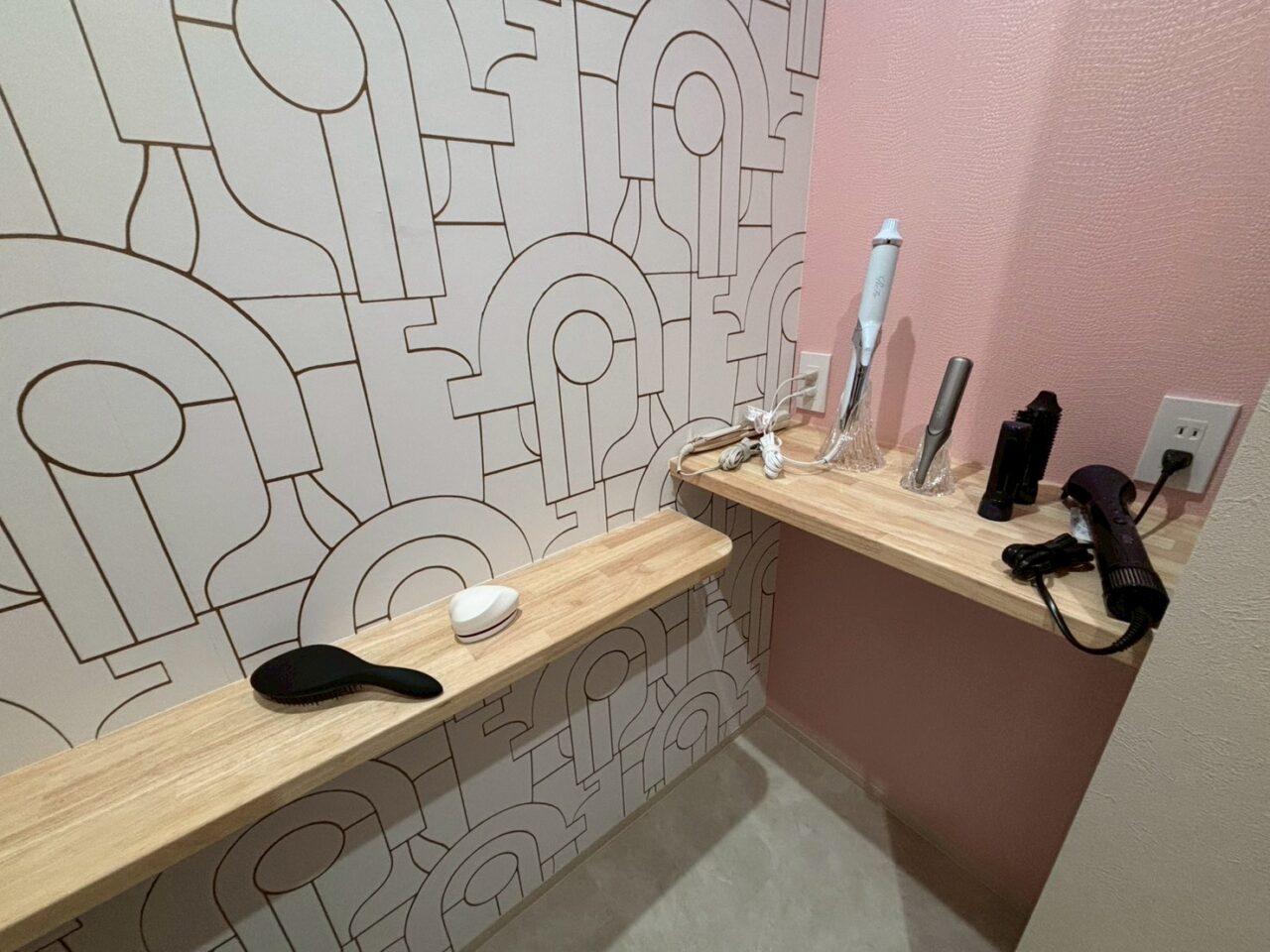 帰りには、ReFa(リファ)を用意しているので、こちらの化粧室で綺麗になって気持ちよくお家に帰るか、お出かけ前にちょっとケアして立ち寄ってお友達に会いにいく空間として利用されるようにと思っているそうです。こちらには、鏡と椅子が入る予定です。