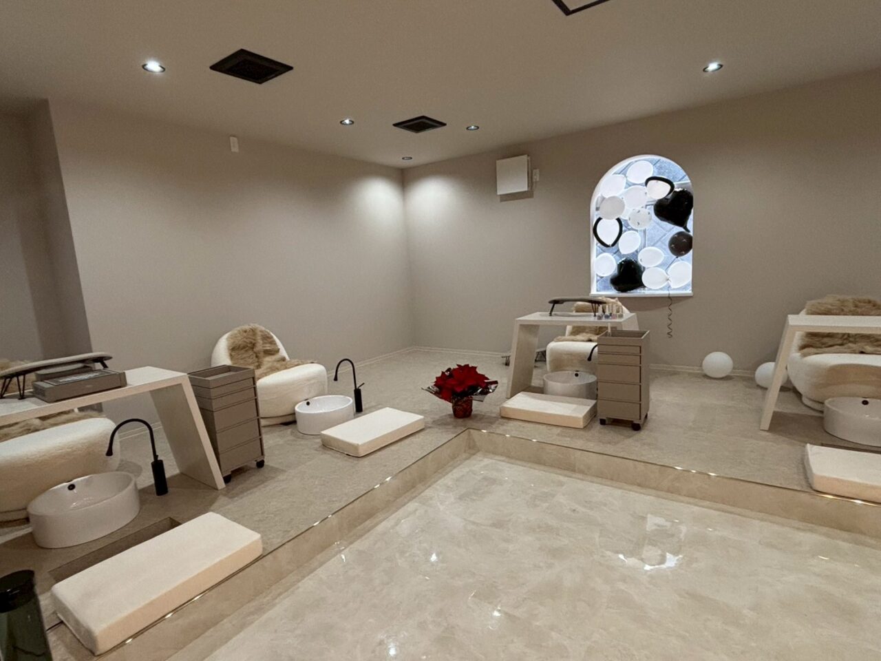 トイレも素敵なお部屋になっています。このお店は異空間で健康と美を気分をあげて帰ってもらうということをコンセプトにしているので、今までネイルをやったことがない人でも、おじいちゃん、おばあちゃんでも使えるような空間です。年齢層高めの人たちが来て、肌を綺麗にしてちょっとでも気持ちよくテンションをあげて帰ってもらいなと思って作った場所です。