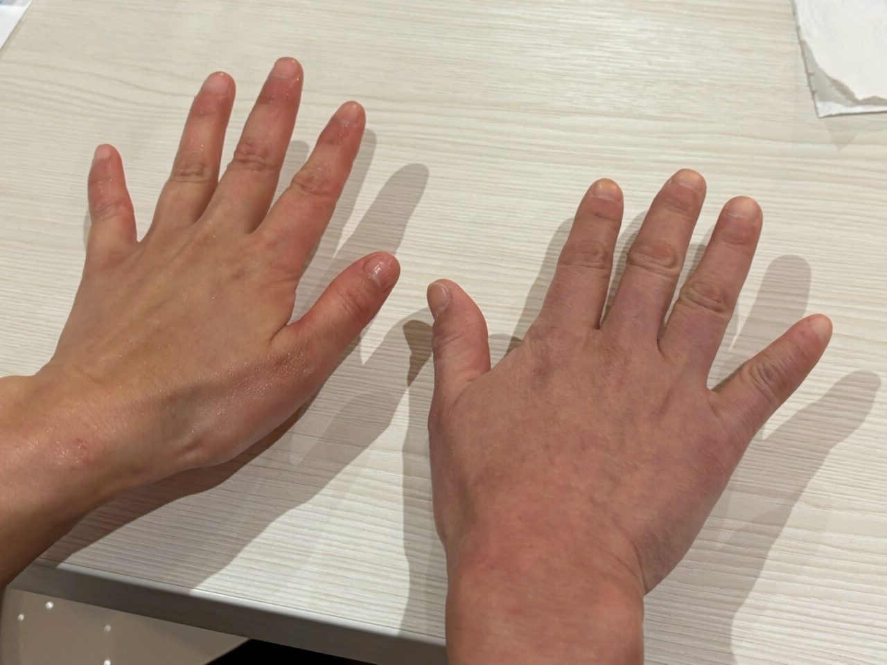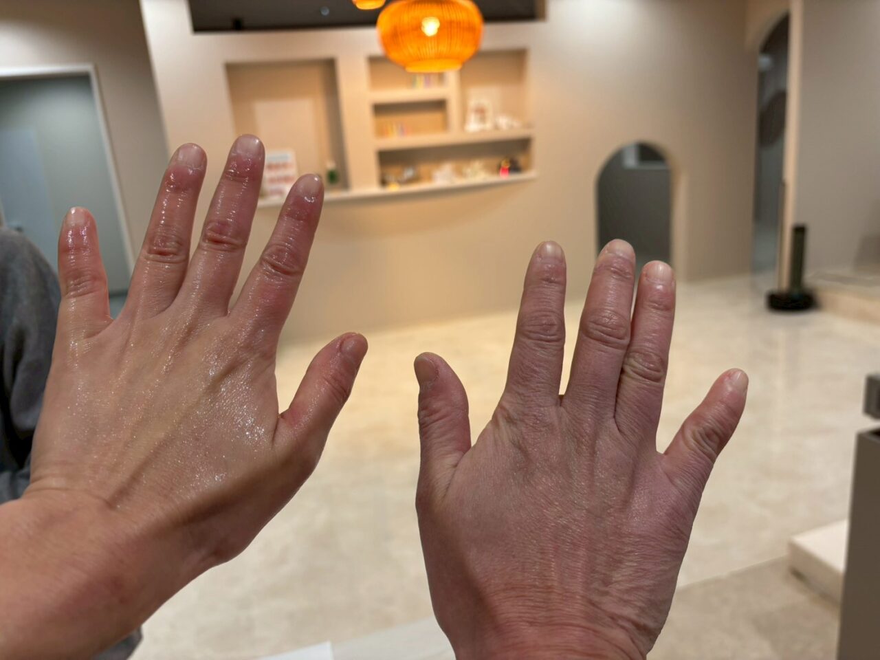 ハンドトリートメントを毎日自分の家でケアして、1か月に1回サロンでケアすることを何回もやることで、ハンドクリームに頼らず自分の手自体が潤ってくれるようになります。1回の施術体験で、上の写真は、左手が施術後、右手が施術前と左右差がでて驚きました。ハンドトリートメントを続けることで、1回のトリートメントで潤いが3.4週間持つようになるそうです。市内でこのような施術をされているのは珍しいです。